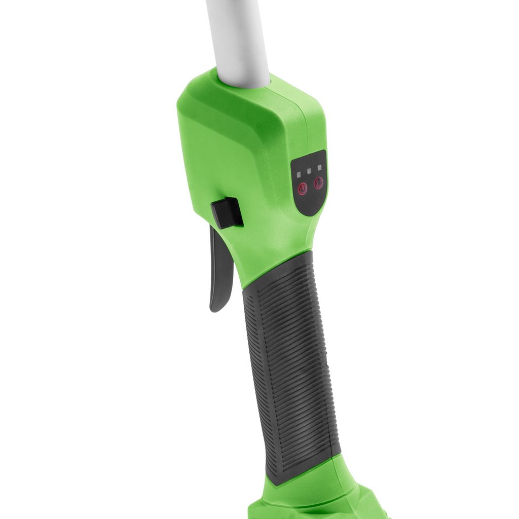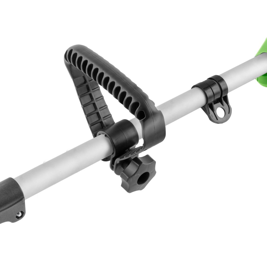 Oblouková rukojeť: umožňuje pohodlné a přirozené vedení křovinořezu jednou rukou, zajišťuje dobrou ovladatelnost a přesnou kontrolu při práci v úzkých nebo hůře přístupných místech. Obloukový tvar rukojeti usnadňuje manévrování kolem stromů, keřů, plotů a okrajů pozemků a zvyšuje komfort při delším používání.