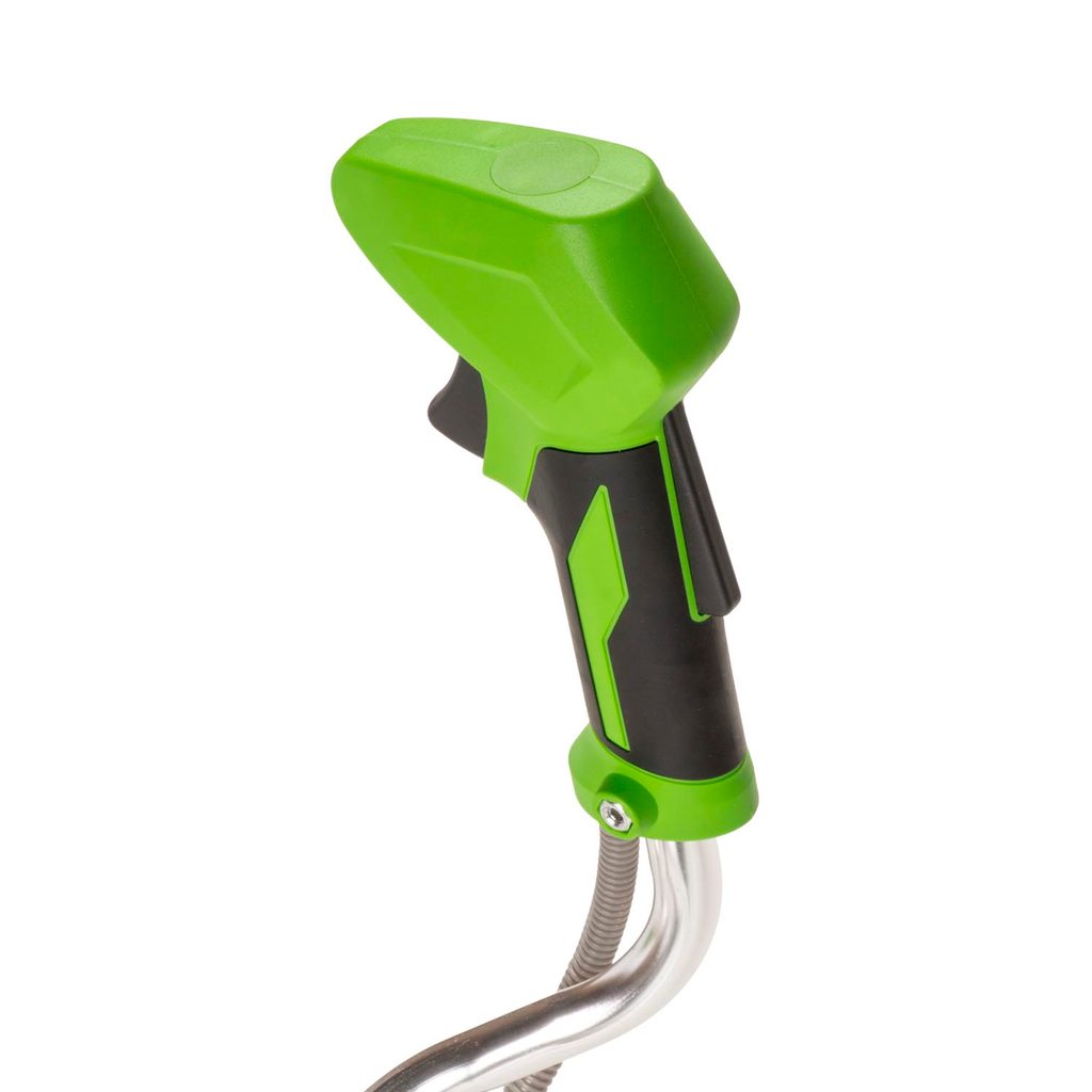 Obouruční rukojeť (řidítka): Ergonomicky tvarovaná obouruční rukojeť poskytuje maximální kontrolu a stabilitu během sekání. Umožňuje přirozenější pohyb, snižuje únavu rukou a zad a zvyšuje přesnost při práci s nástrojem.