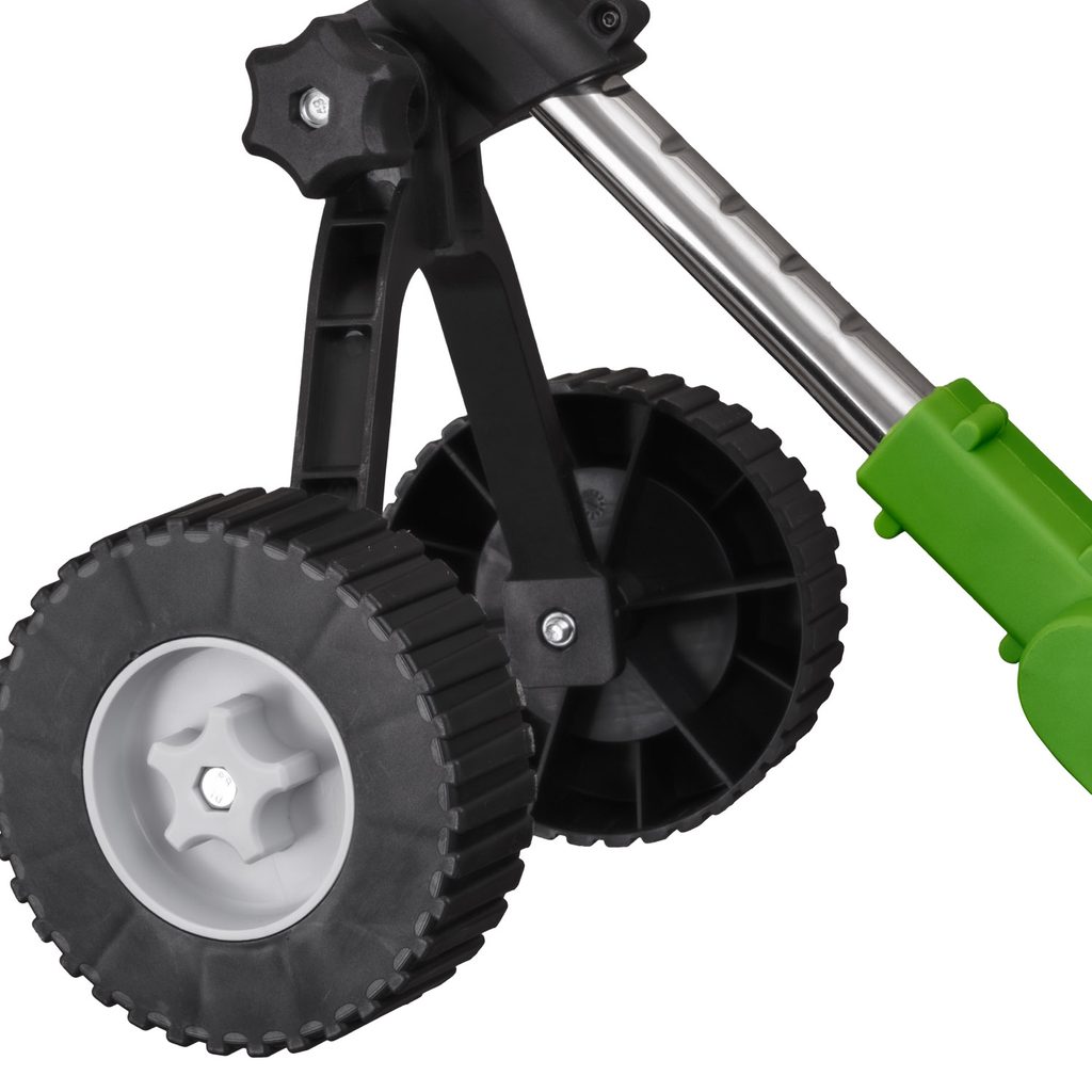 Mobilní konstrukce na kolečkách: Umožňuje plynulý pohyb po trávníku bez nutnosti držet celou hmotnost stroje, ideální pro delší práci.
