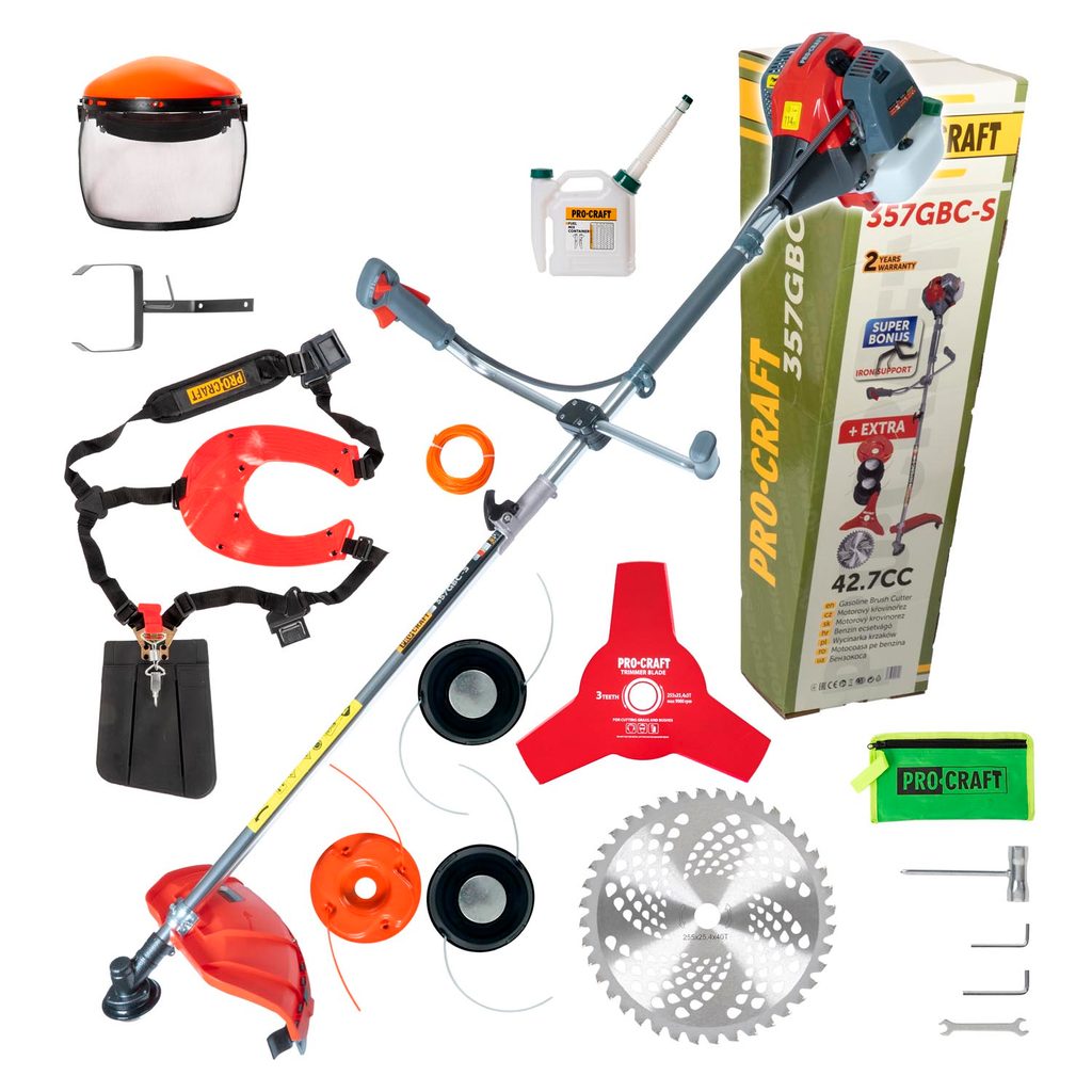 Benzínový křovinořez Procraft 357GBC je určen k sečení a vyžínání travnatých ploch, k odstranění náletů drobných dřevin do průměru 1,5cm . Silný dvoutaktní motor 42,7ccm otáčkách 8000/min zaručuje dostatečný výkon a dlouhou bezporuchovou práci. Ovládání vysouvání struny je poloautomatické. Součástí dodávky je 3x strunová hlava s kovovou spodní částí, pilový kotouč na dřeviny, 3.zubý nůž, ochranná maska, žací struna, nádoba na přípravu palivové směsi, dvouramenný popruh a sada klíčů. Průměr tyče 28mm a 9.hvězdicová zaručí delší životnost převodů. Předepsaná směs oleje a benzínu je 1:40 (při záběhu 1:25) Balení karton.