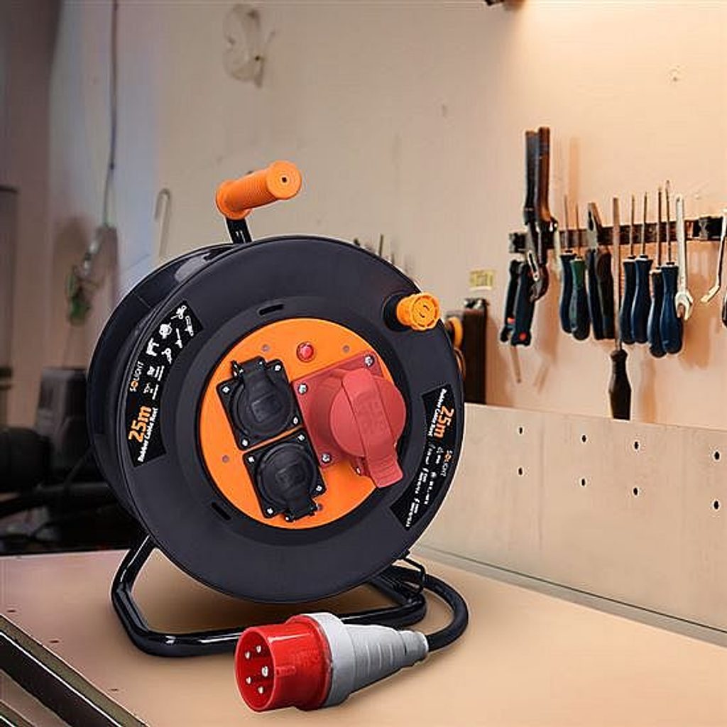 Robustní prodlužovací přívod na bubnu s délkou 25 metrů, jednou zásuvkou na 400 V a dvěma zásuvkami na 230 V je ideální volbou pro napájení stavebních strojů, profesionálního nářadí nebo dílenského vybavení.