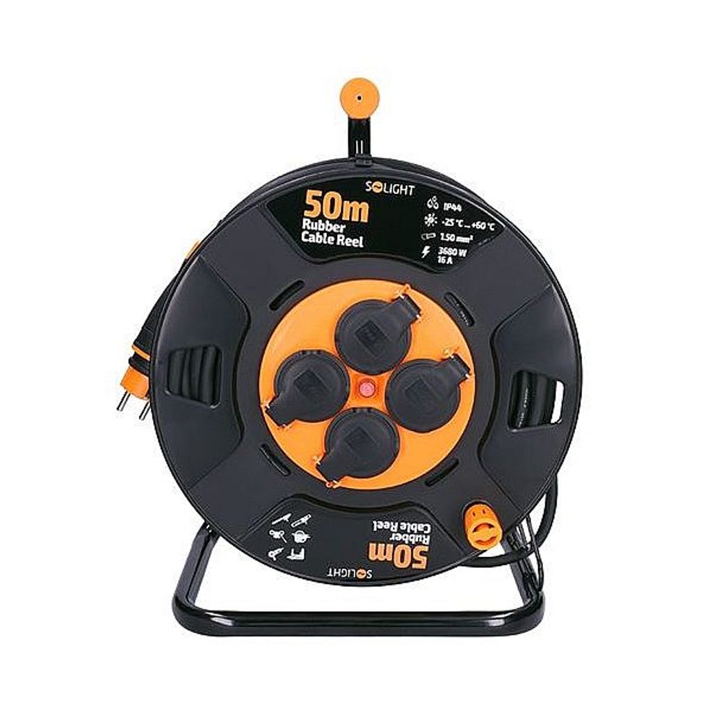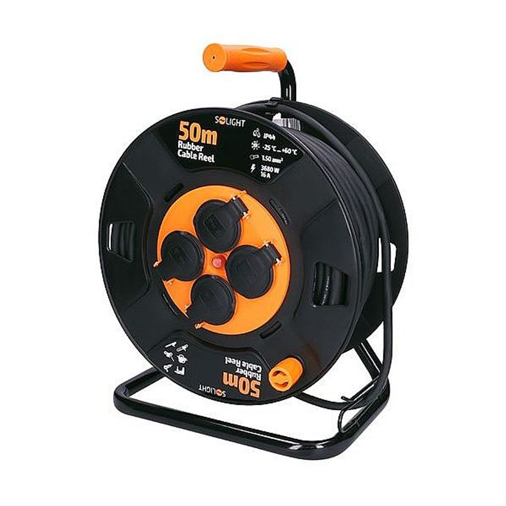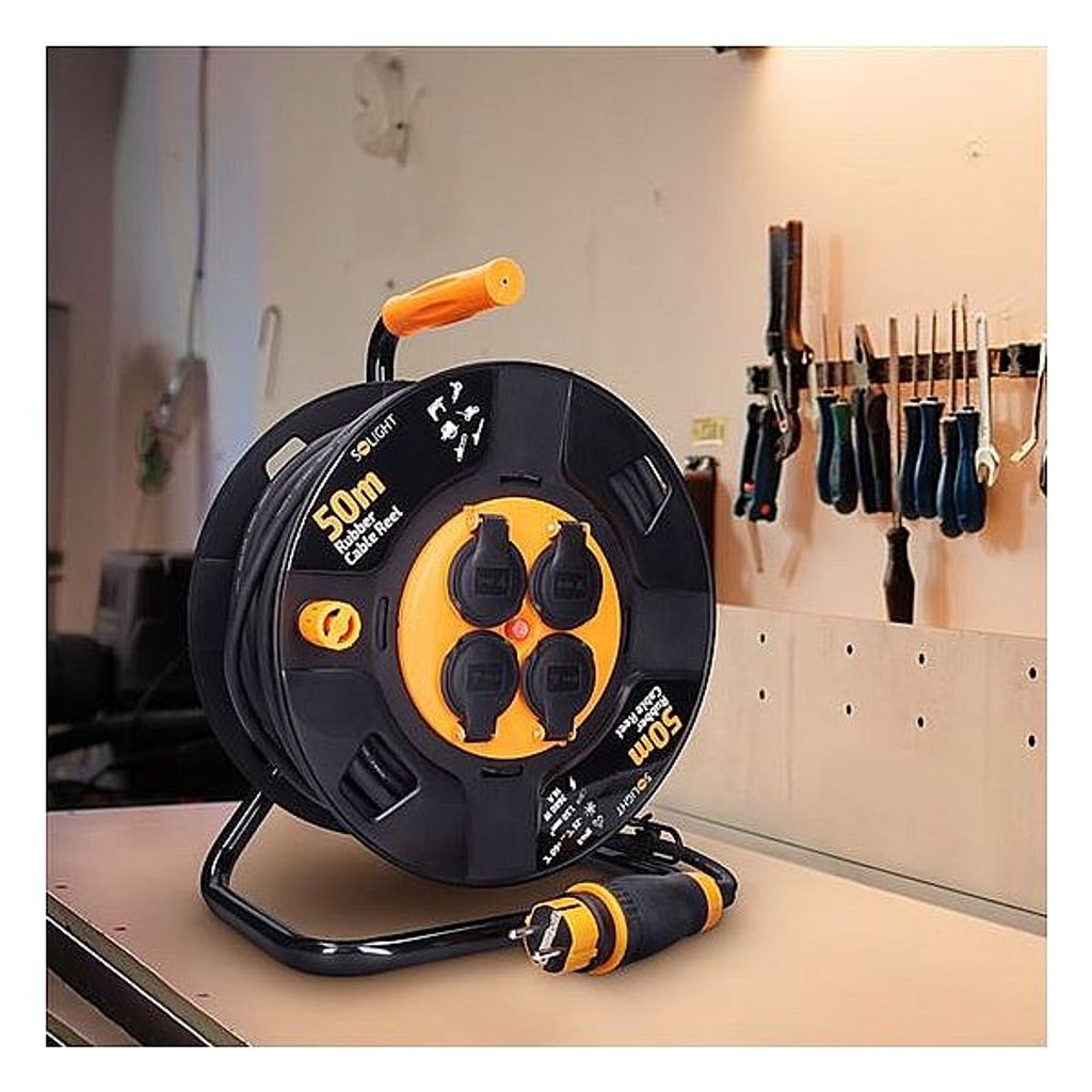 Prodlužovací kabel na navíjecím bubnu s délkou 50 metrů a čtyřmi zásuvkami je ideální pro použití venku, na stavbách nebo v dílnách.