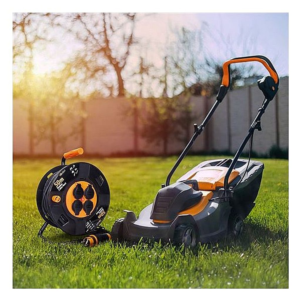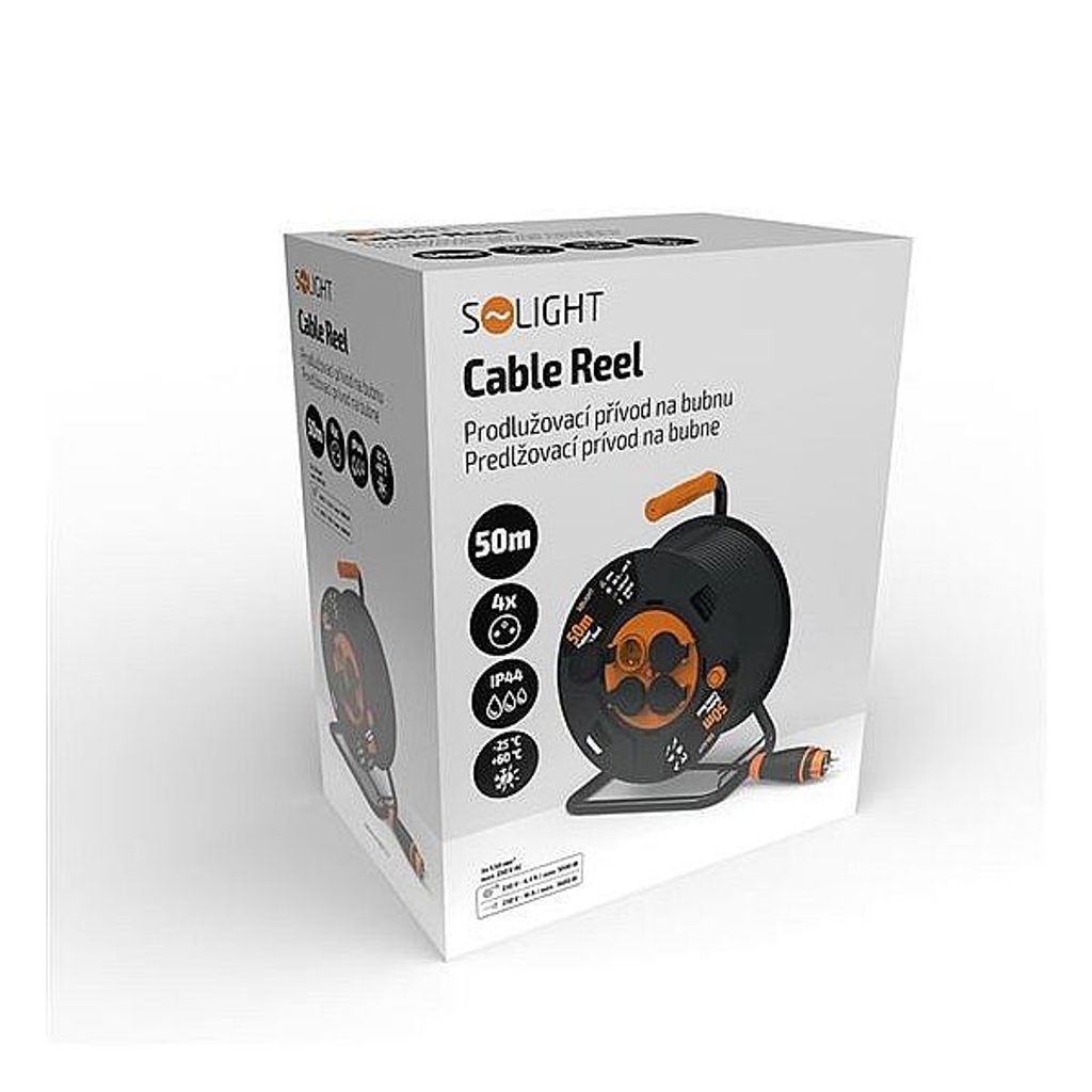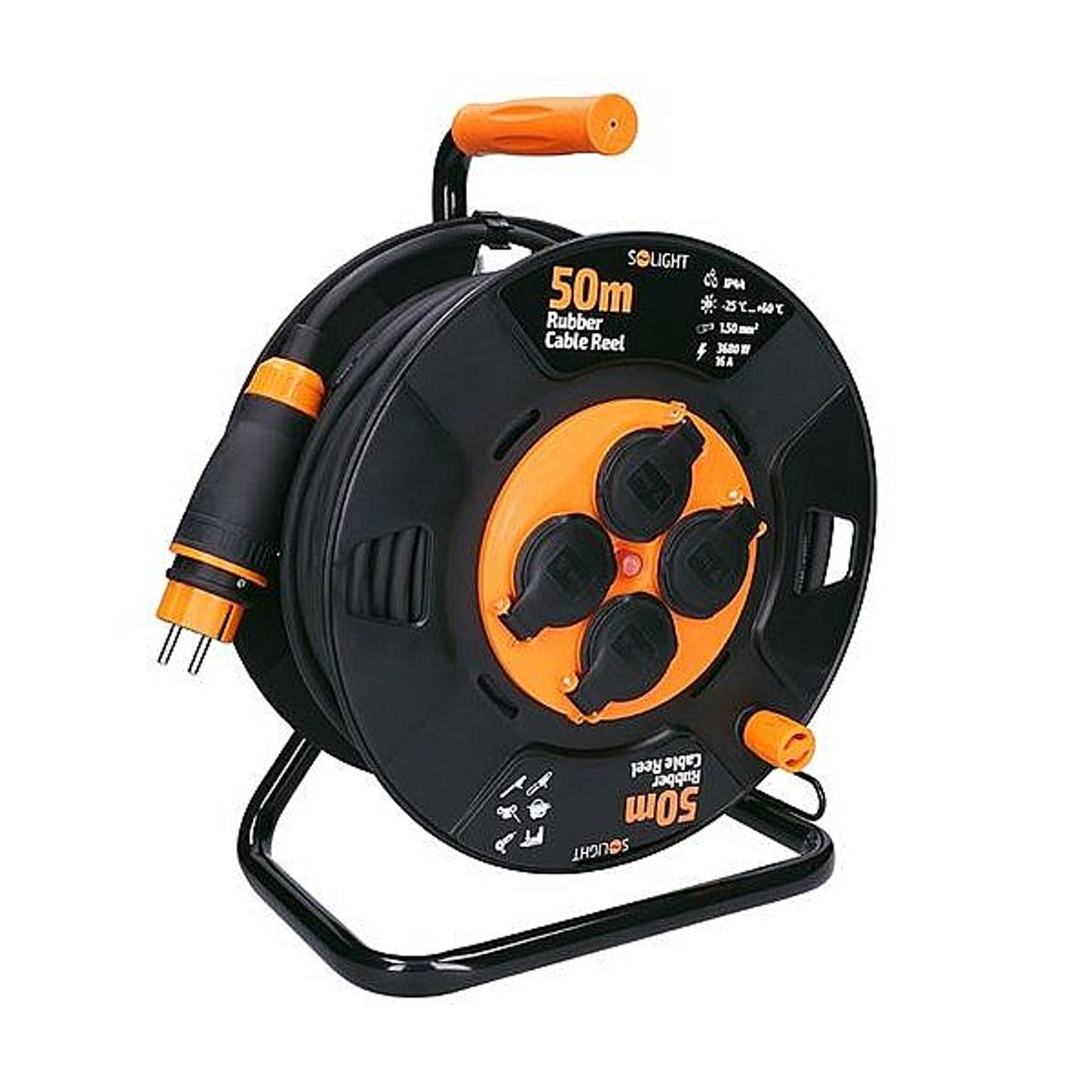 Prodlužovací kabel na navíjecím bubnu s délkou 50 metrů a čtyřmi zásuvkami je ideální pro použití venku, na stavbách nebo v dílnách.