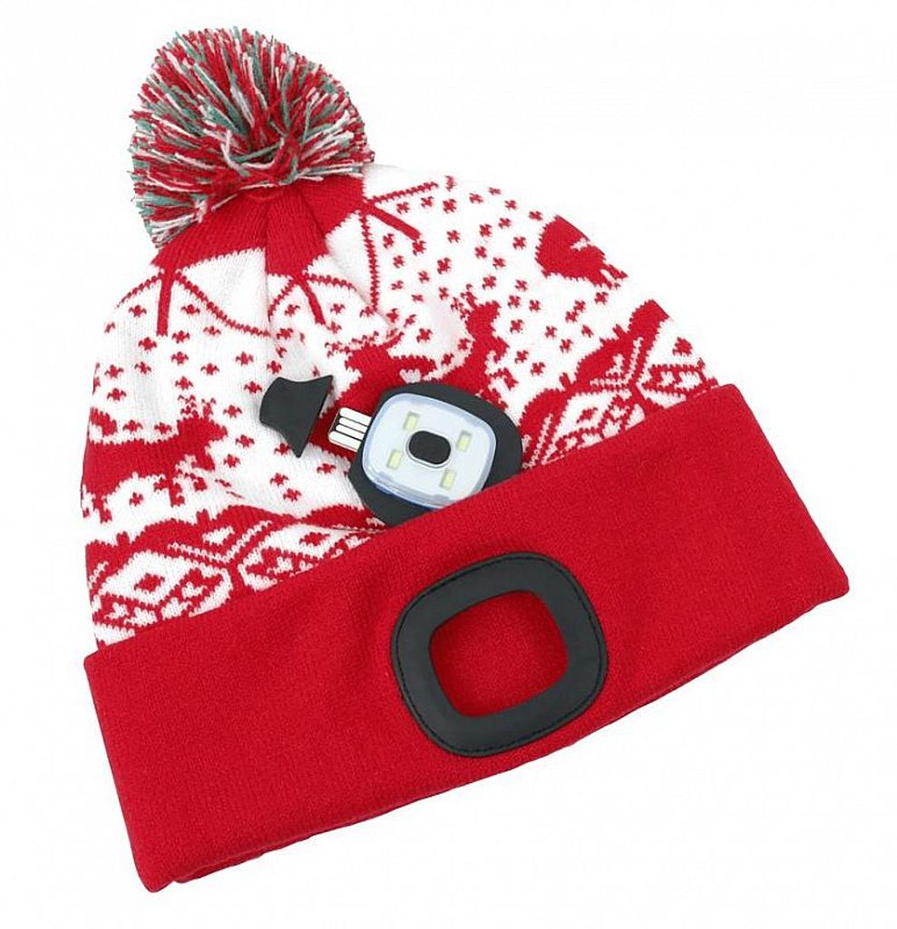 Čepice X-mas červená L, 4x SMD LED, 60 lm s bambulí a vánočním motivem.