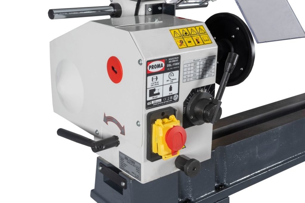 Soustruh na dřevo DSL-1100V je určen pro běžné soustružení rotačních válcových, kuželových a tvarových ploch z měkkého i tvrdého dřeva. Pomocí příslušenství, například kopírovacího zařízení je možné docílit stejných tvarových ploch u více kusů (pouze malé série). Cílové otáčky soustruhu zajišťuje mechanický variátor, který při chodu stroje plynule mění otáčky bez ztráty výkonu. Vše doplňuje litinová konstrukce stroje, která zajišťuje tuhost a přesnost obrábění.
