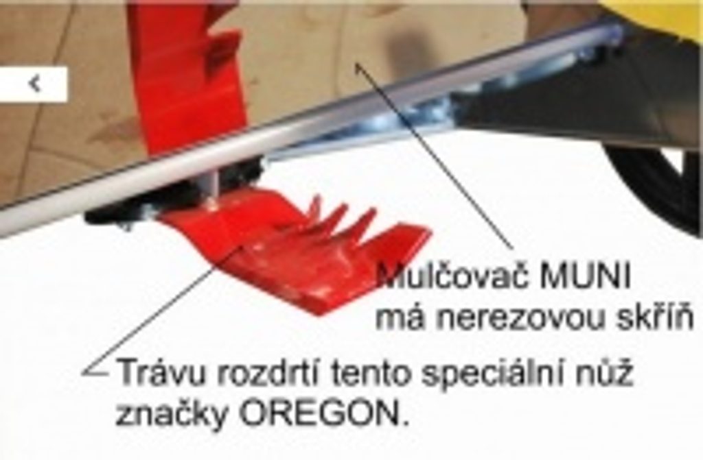 Mulčovač je vhodný k sečení luk a zahrad, bez nutnosti hrábání posečené trávy. Na rámu je uchycen mulčovací nástavec, které lze jednoduše demontovat. Stroj je vybaven brzdou žacího nástroje, po vypnutí se zastaví do 5 vteřin. Do budoucna připravujeme i nástavec bubnové sekačky, čímž vznikne stavebnice, která umožní střídat mulčování a sečení tak, aby nedošlo k znehodnocení pozemku.