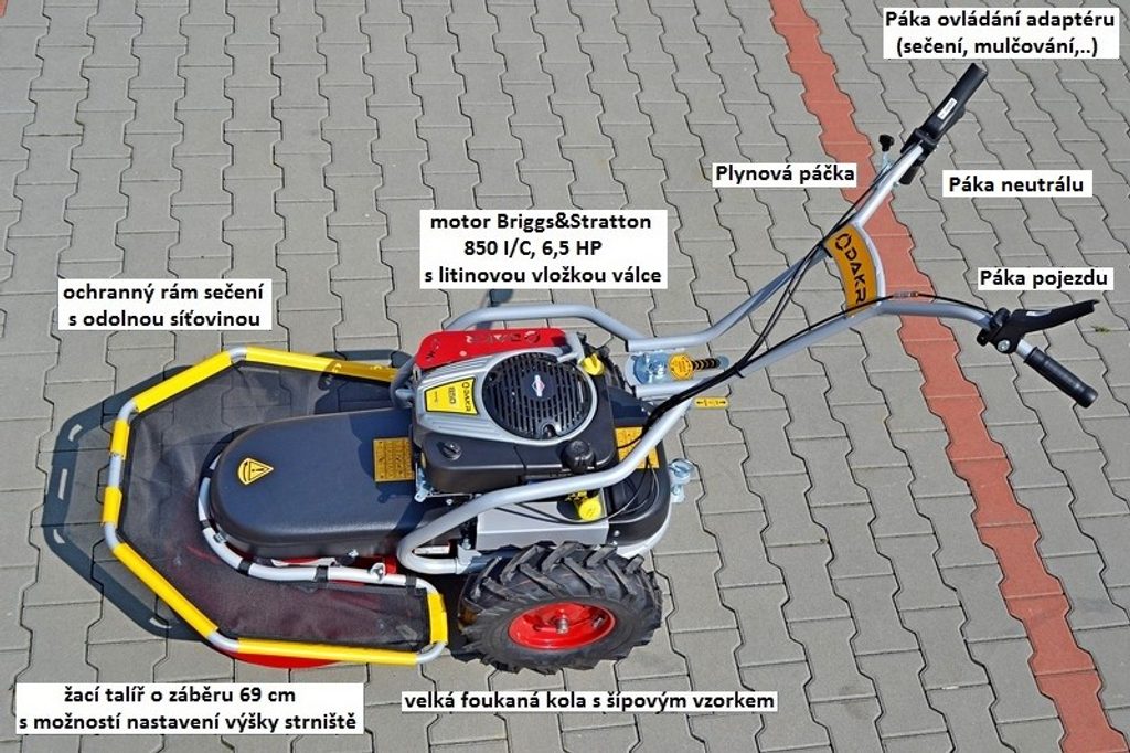 Cena DAKR Panter FD2 L224 + RZS70K: 39.140 KčJde o zakládní sestavu stavebnice Panter v podobě sekačky do náročného resp. kopcovitého terénu. Na rovinách a mírných svazích má dostatečný výkon a tuhost na to, aby obsluha mohla při práci pohodlně sedět na přídavné sedačce. V našem sortimentu najdete řadu adaptérů kompatibilních s touto pohonnou jednotkou pro přestavbu na mulčovač, obraceč a shrabovač, frézu a radlici na sníh, vozík, zametací kartáč, rotavátor, drtič větví atd.