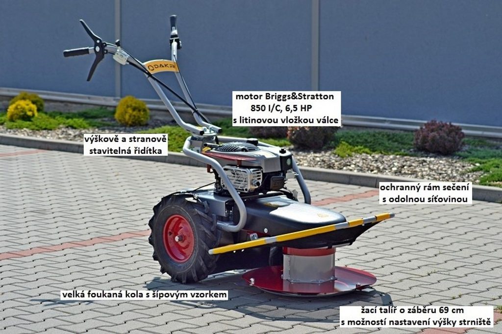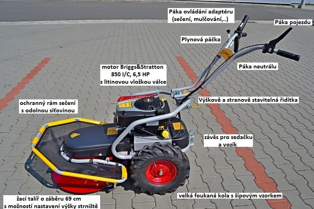 stavebnicová bubnová sekačka s pojezdem; záběr sečení 69 cm; max. výkon motoru Loncin 7,3 HP; tři rychlosti vpřed