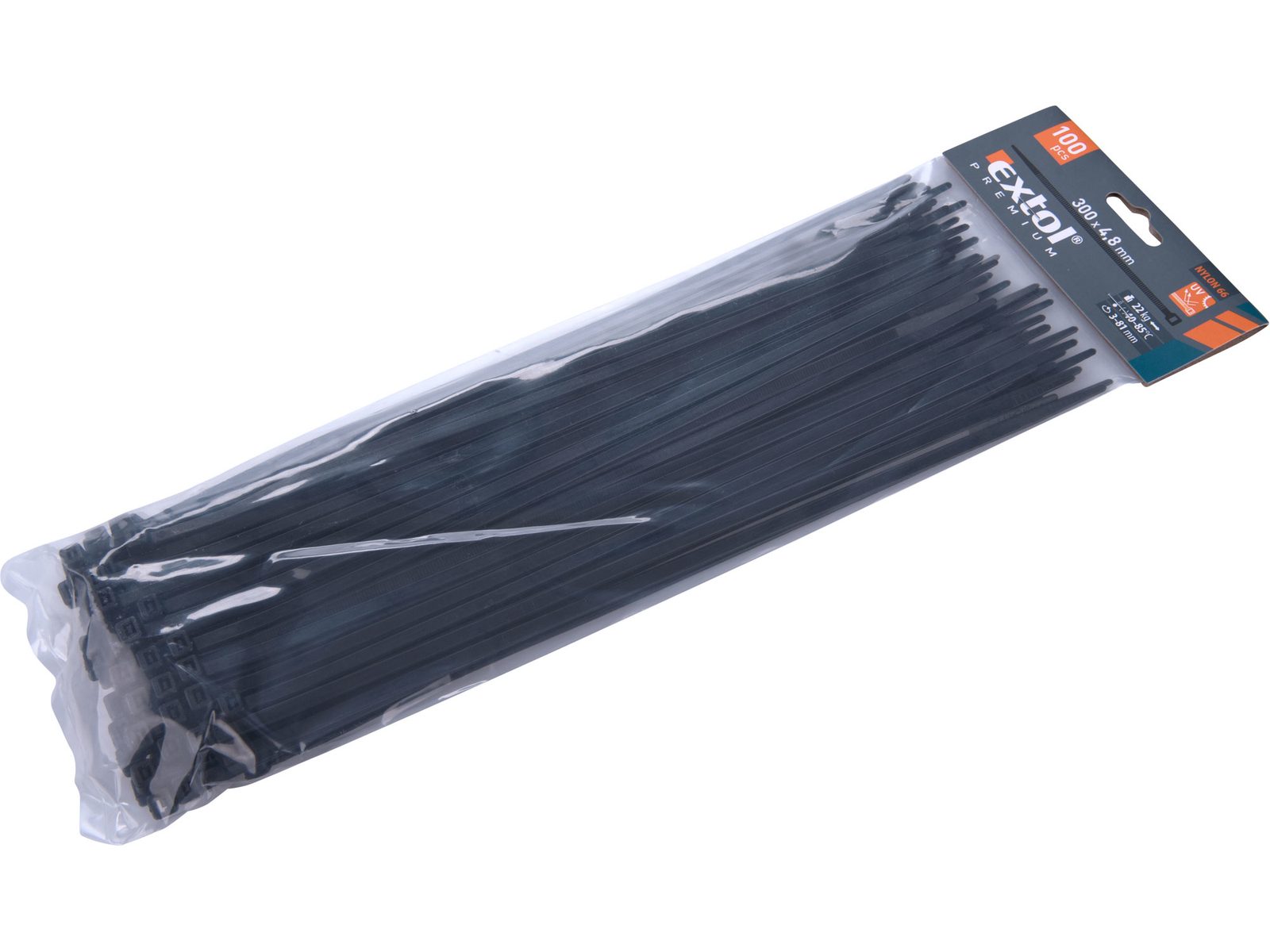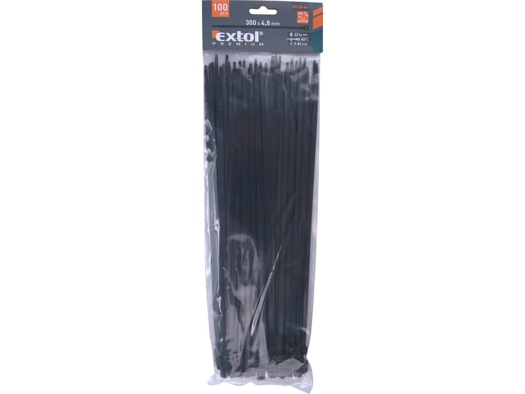 Buďte první, kdo ohodnotí "EXTOL PREMIUM pásky stahovací na kabely černé, 300x4,8mm, 100ks, nylon PA66, 8856162"