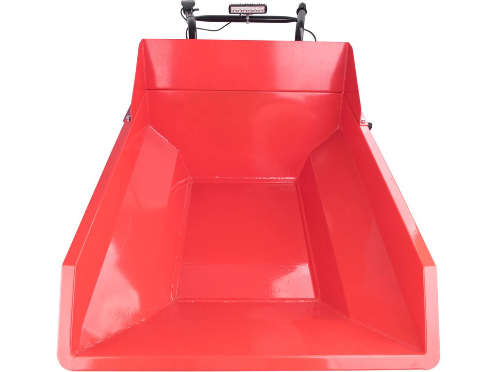 Přepravní aku transportér s elektrickým pohonem je určen pro přepravu tuhých, sypkých nebo hustých materiálů. Díky elektrickému pohonu výrazně urychluje přeprava materiálu a zároveň snižuje únava obsluhy, což významně zvyšuje produktivitu práce. Stroj má na pravé rukojeti ovladač kde si pomocí palce nastavíte okamžitou rychlost jak dopředu, tak dozadu. Na ovladači lze přepnout jízdu dopředu nebo dozadu, brzdu, normální rychlost nebo Turbo. Pro běžný provoz se používá normální rychlost, Turbo lze použít při jízdě do kopce, v obtížném terénu nebo při přepravě těžšího nákladu. Transportér je poháněn nejmodernějším „brushless" motorem. Tento nový typ motoru má vyšší životnost, je výkonnější a má menší spotřebu el. energie než klasické motory s uhlíkovými kartáči. Pokud je to nutné, lze motor kompletně vypnout a používat kolečko jen na ruční pohon. Zabudovaná převodovka s diferenciálem výrazně zlepšuje prostupnost terénem a výkon motoru při jízdě do kopce. Diferenciál umožňuje otočení koleček na místě. Veškerý náklad v transportéru je vezen na kolech a obsluha jen řídí směr. Stroj je vybaven dvěma brzdami – elektrickou, kterou může aktivovat na ovladači a manuální, která slouží jednak k dobržďování při jízdě z kopce, ale díky pojistce ji lze také zaaretovat při brzdění. Pneumatiky mají hluboký vzorek do terénu s dobrou trakcí. Transportér je dodáván s kovovou korbou o objemu 200l pro sypký materiál. Pro přepravu delších nebo objemnějších věcí jako jsou patníky, trubky, velká polena, apod., lze dokoupit kovovou nadstavbu s bočnicemi. Obě nástavby se jednoduše vyklápějí pomocí boční vysunovací tyče. Pokud často jezdíte na rovném povrchu, můžete si také dokoupit závěsnou plošinu a vozit se za transportérem. S aku transportérem je možné pracovat i za deštivého počasí a je vybaven silným LED světlem pro práci za snížené viditelnosti. Transportér je nutno skladovat v suchém a před počasím chráněném prostoru. Před naložením do auta můžete vysunout ručky, aby se zmenšila délka při přepravě. Zdrojem elektrické energie je silná 54V/15Ah Li-ion baterie s LED displejem ukazujícím její úroveň nabití a okamžité napětí baterie. Vyjímatelná baterie umožňuje její snadné nabíjení a skladování v suchém a zatepleném prostředí, což je velmi důležité pro její životnost. Baterie má ochranu proti vybití pod minimální úroveň, před přetížením při nadměrném odběru proudu, přebitím, zkratem a náhlému zvýšení teploty při práci. Pro běžnou práci dostačuje jeden 15Ah akumulátor, který můžete rychle nabít v rychlonabíječce, pro náročnější nebo delší práci můžete použít další nabitý akumulátor. Díky použité Li-ion technologii je ho možné kdykoliv dobíjet, aniž by se tím snižovala jeho kapacita. Li-ion akumulátor velmi pomalu ztrácí energii vlivem samovybíjení a vydrží dlouho nabitý a připravený k použití.