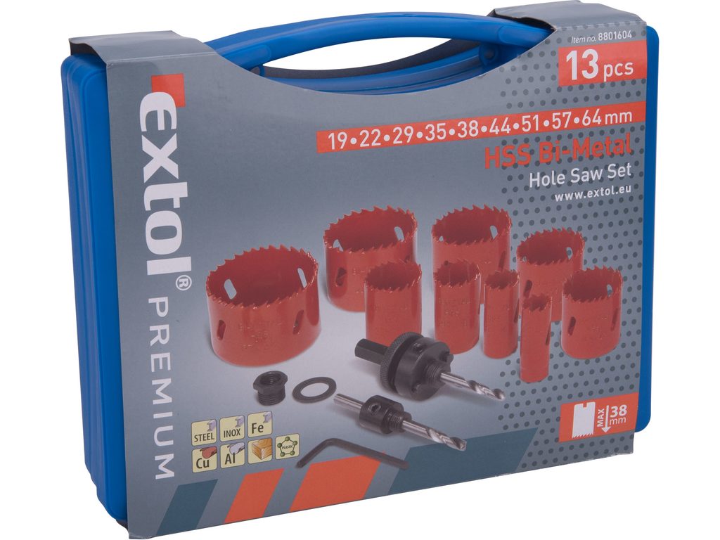 Buďte první, kdo ohodnotí "EXTOL PREMIUM vrtáky korunkové, univerzální, 9 průměrů O 19-64mm, HSS/Bi-metal, 8801604"