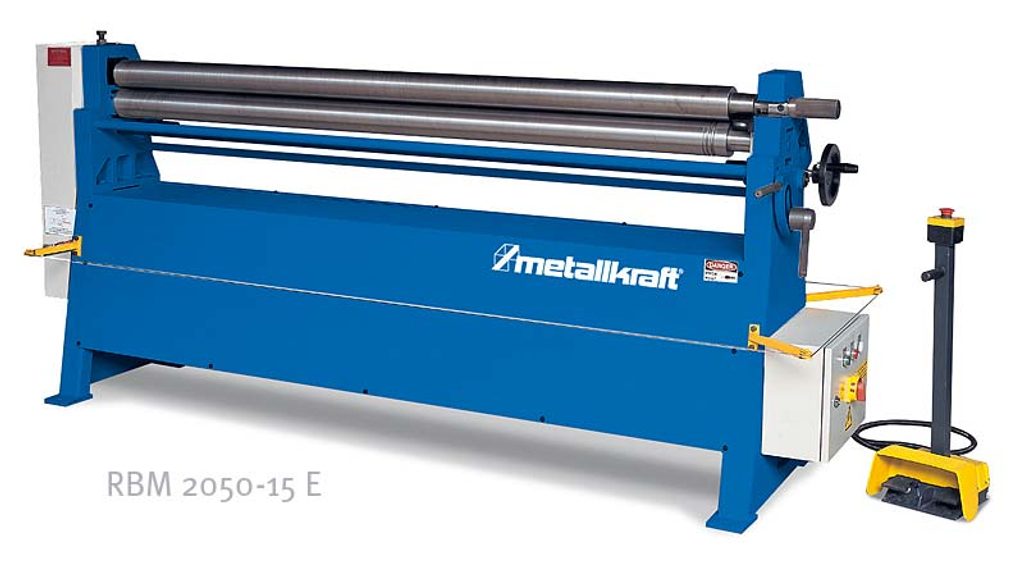 Stabilní výkonná zakružovačka plechu se samostatně nastavitelnými válci a nožním ovládáním pro průmysl a řemeslné dílny. Pracovní šířka 2,05 m, tloušťka plechu max. 1,5 mm.