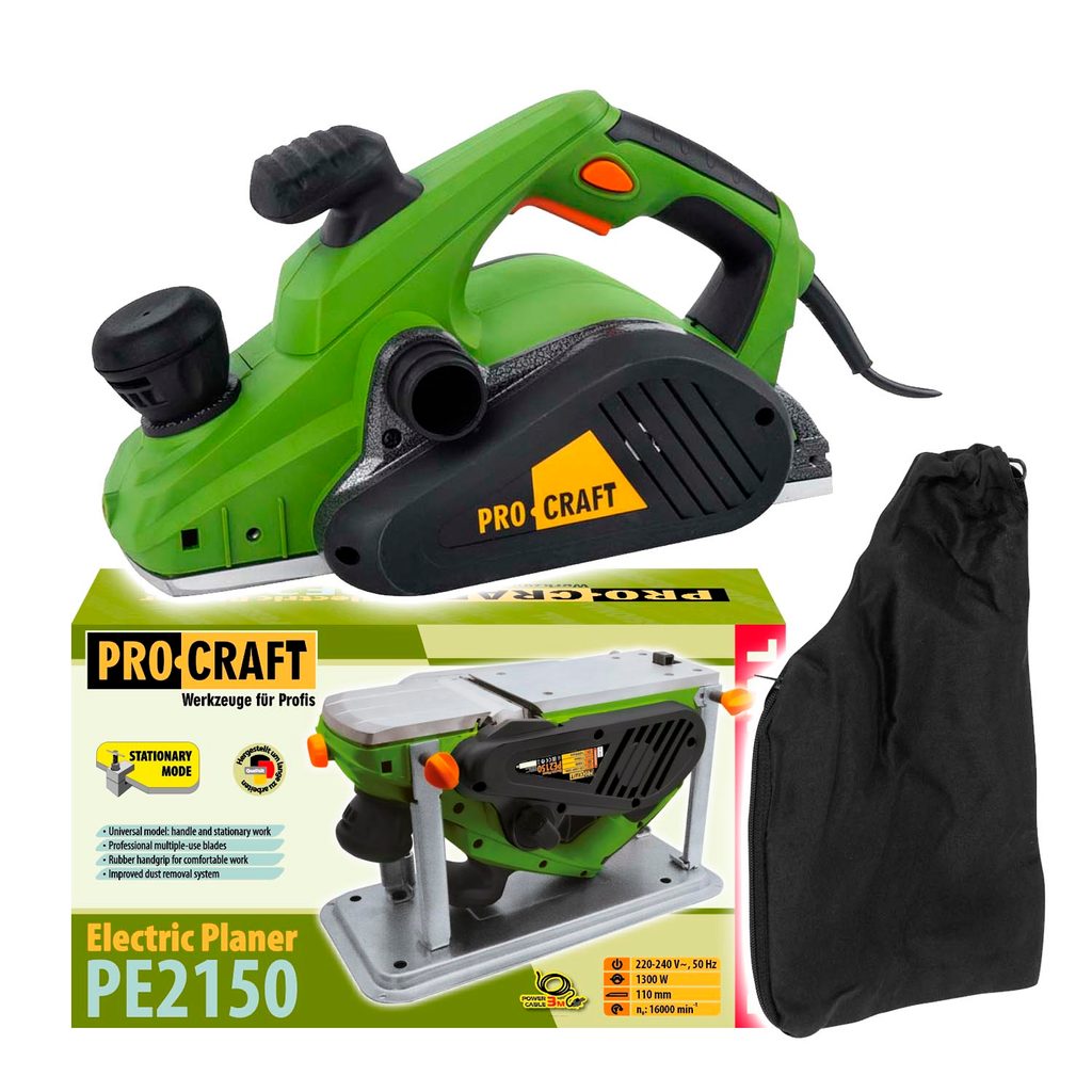 Elektrický hoblík Procraft PE2150 je určen k hoblování, drážkování a srážení dřeva. Vysokou výkonnost práce umožňuje hoblovací nože s šířkou 110 mm a silný motor s výkonem 1300 W a vysokých otáček až 16500. Regulace brusné hloubky v rozsahu 0-3 mm umožňuje nastavení optimálních parametrů při práci s různými materiály. Možnost broušení nožů snižuje náklady na údržbu. Součástí dodávky je stojan pro hoblík, vak na hobliny a klíč. Balení karton.