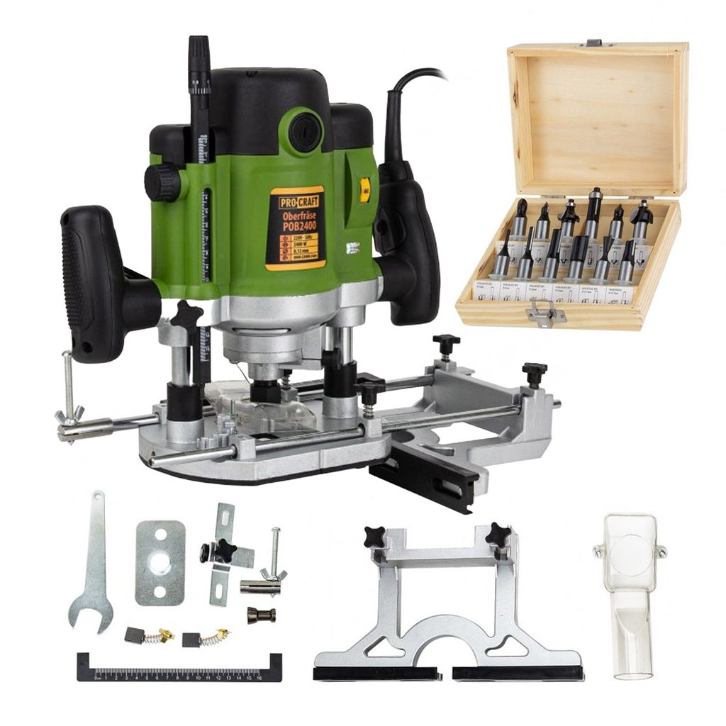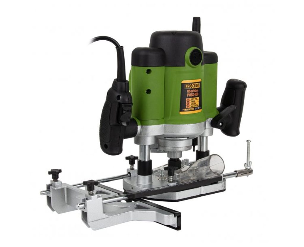 Frézka Procraft POB2400 je určena k frézování profilů, hran, otvorů do dřeva. Silný motor s výkonem 2000W a vývojem otáček až 23000 zaručuje dlouhou bezporuchovou prací. Regulace otáček v rozsahu 8000-23000 za minutu umožňuje nastavení optimálních parametrů při práci s různými materiály. Lze použit frézy se stopkami 8 a 12mm. Základna umožňuje přesné nastavení hloubky řezu v rozsahu 0-50mm. Součástí dodávky jsou 12 fréz, podélný doraz s vodícími tyčemi, upínací kleštiny, uhlíkové kartáče a adaptér na odsávání. Balení karton.