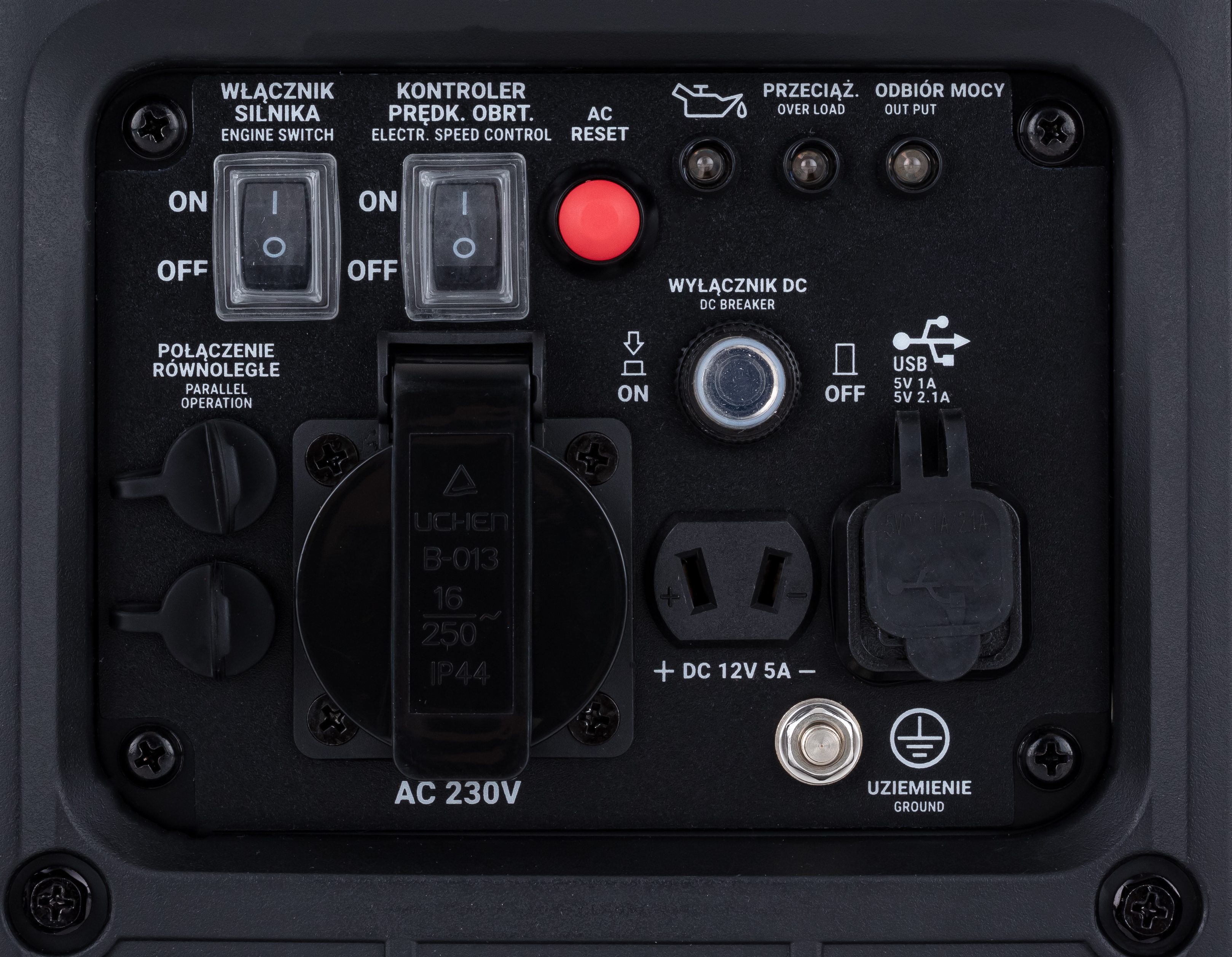 Pohodlné uspořádání všech základních funkcí: indikátory provozního stavu: ochrana proti přetížení a zkratu, ochrana proti nedostatku oleje, resetovací tlačítko pro resetování řídicího systému a obnovení napájení, připojení pro paralelní připojení generátorů