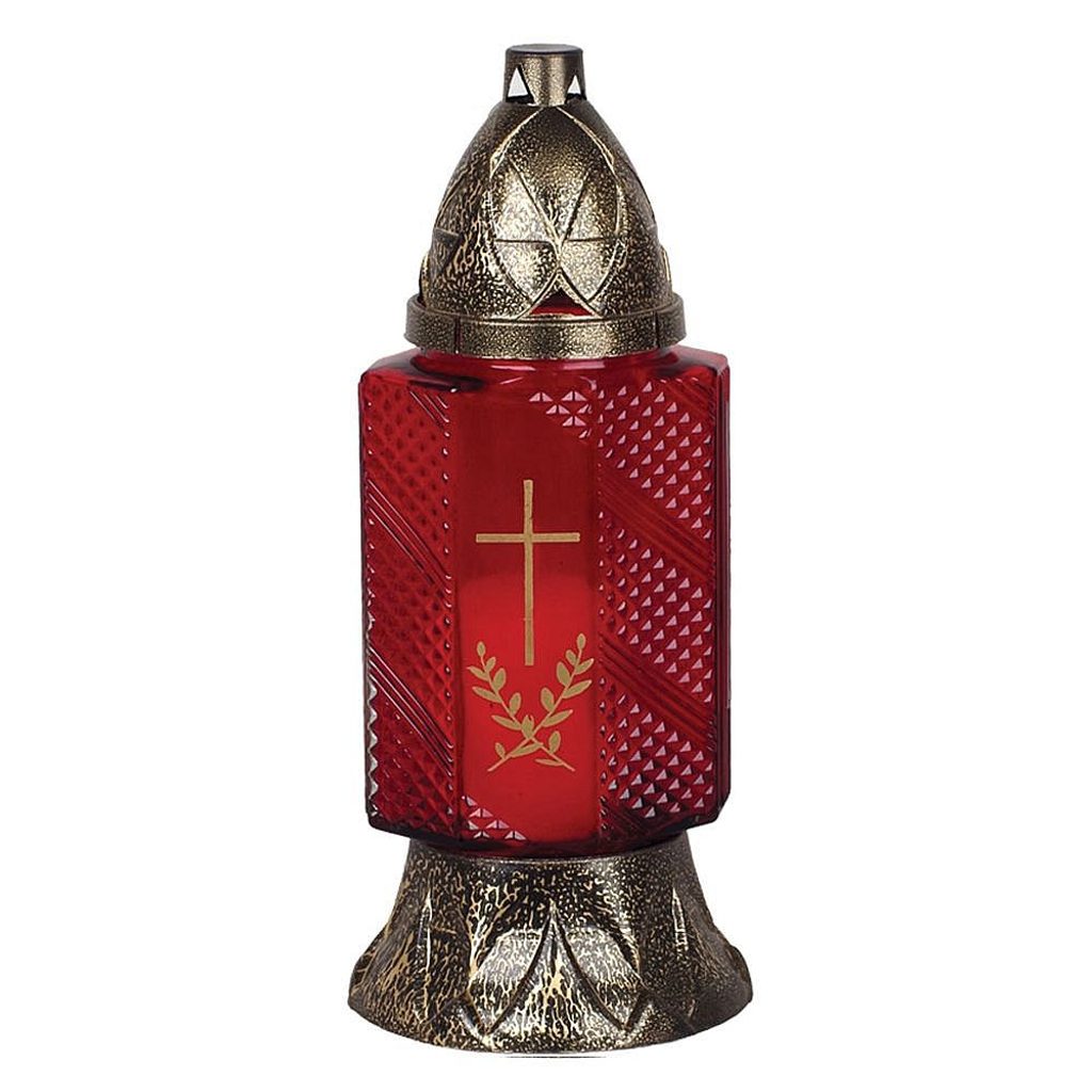 Klasický cenově dostupný kahanec na hrob s křížem z červeného skla.