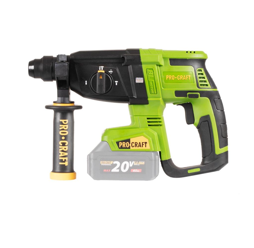 Kombinované AKU kladivo Procraft PHA40bb s upínáním SDS Plus je určeno k vrtání a lehkým bouracím pracím. Jako příslušenství lze použít SDS Plus příklepové vrtáky do betonu, ploché - špičaté nebo tvarované sekáče na stavební materiály, hadovité (spirálové) vrtáky a dláta do dřeva.