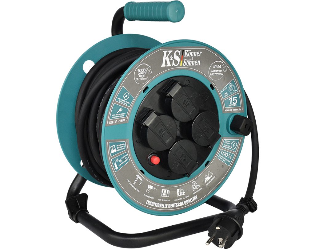 Prodlužovací kabel na navijáku má délku kabelu 15 metrů a je vhodný pro vzdálené připojení 4 elektrických spotřebičů současně. Může být použit pro stavební a opravárenské práce, zemědělský průmysl, továrny a sklady. Je spolehlivým asistentem při kempování a na venkově.