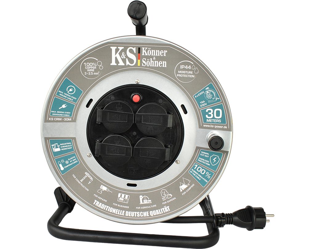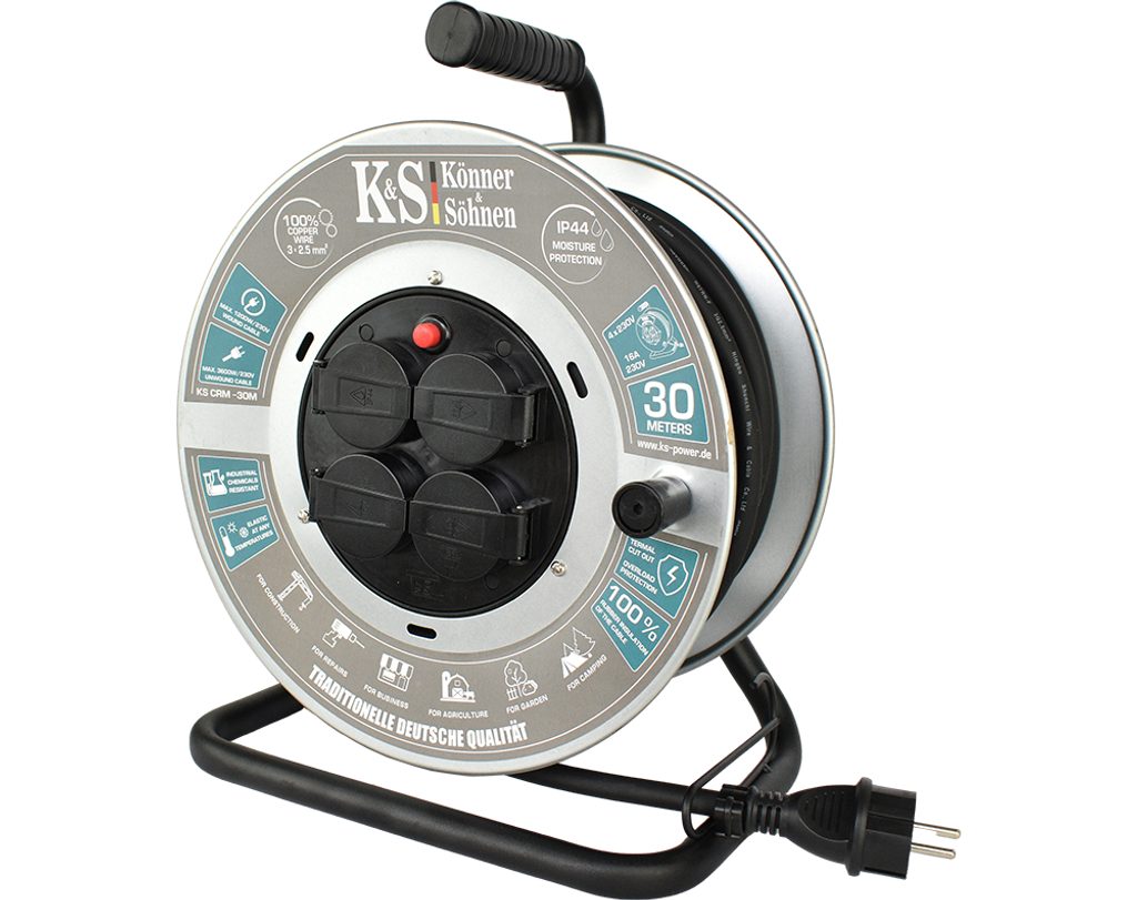 Prodlužovací kabel s navijákem KS CRM-30M a délkou kabelu 30 metrů je vhodný pro připojení až 4 zařízení současně k síti 230V v místech, které jsou daleko od zásuvek. Má třídu ochrany IP44, která umožňuje použití kabelu venku i při vysoké vlhkosti díky ochranným vlastnostem proti náhodnému vniknutí kapiček vody a pevných částic.
