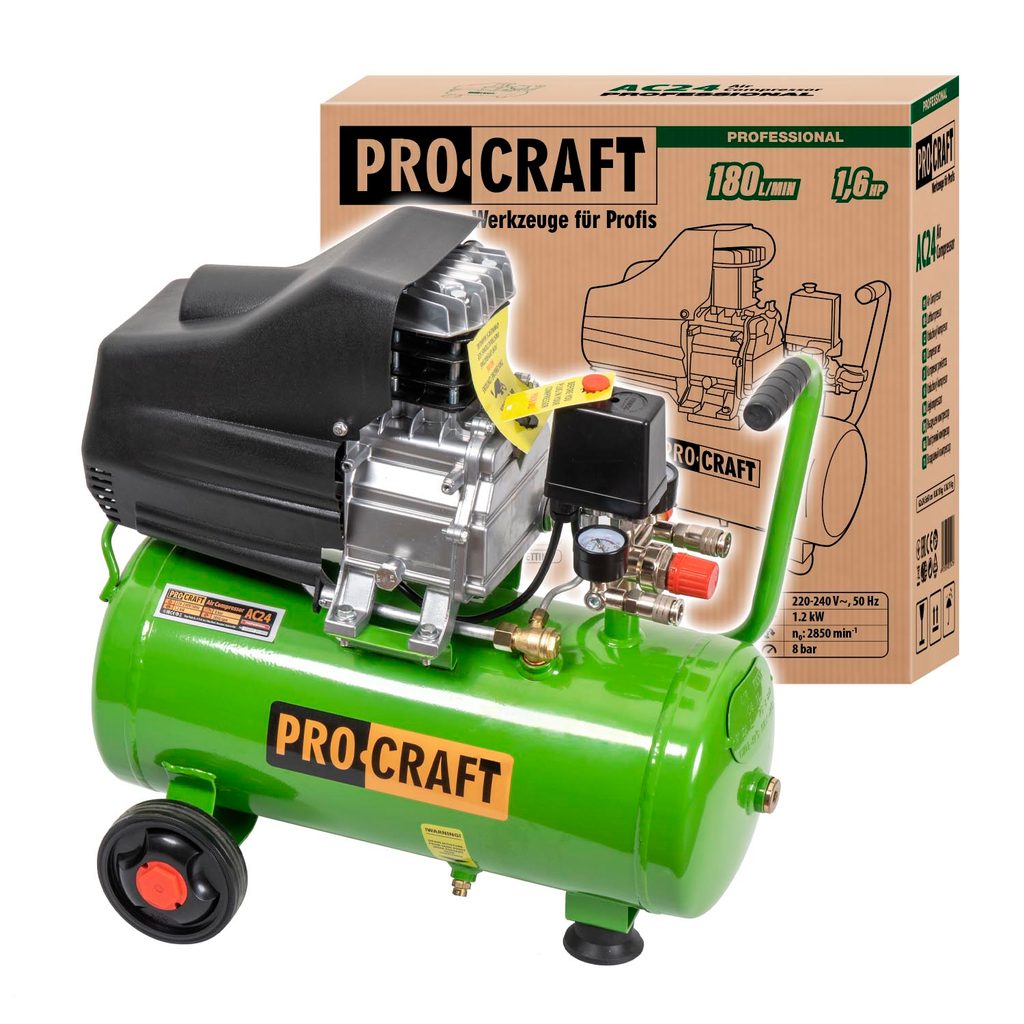 Kompresor Procraft AC24 je určen ke stlačení vzduchu pro provoz pneumatického nářadí, huštění pneumatik. Silný motor s výkonem 1200 W zaručuje vysoký sací výkon až 196 l/min. Mazání olejem zvyšuje životnost kompresoru, a optický ukazatel usnadňuje kontrolu jeho stavu. Regulace výše pracovního tlaku umožňuje nastavení optimálních parametrů podle zvoleného vzduchového nářadí. Rychlospojky vývodů usnadňují a zrychlují práce. Součástí dodávky jsou přepravní kola, pryžové botky. Balení karton.