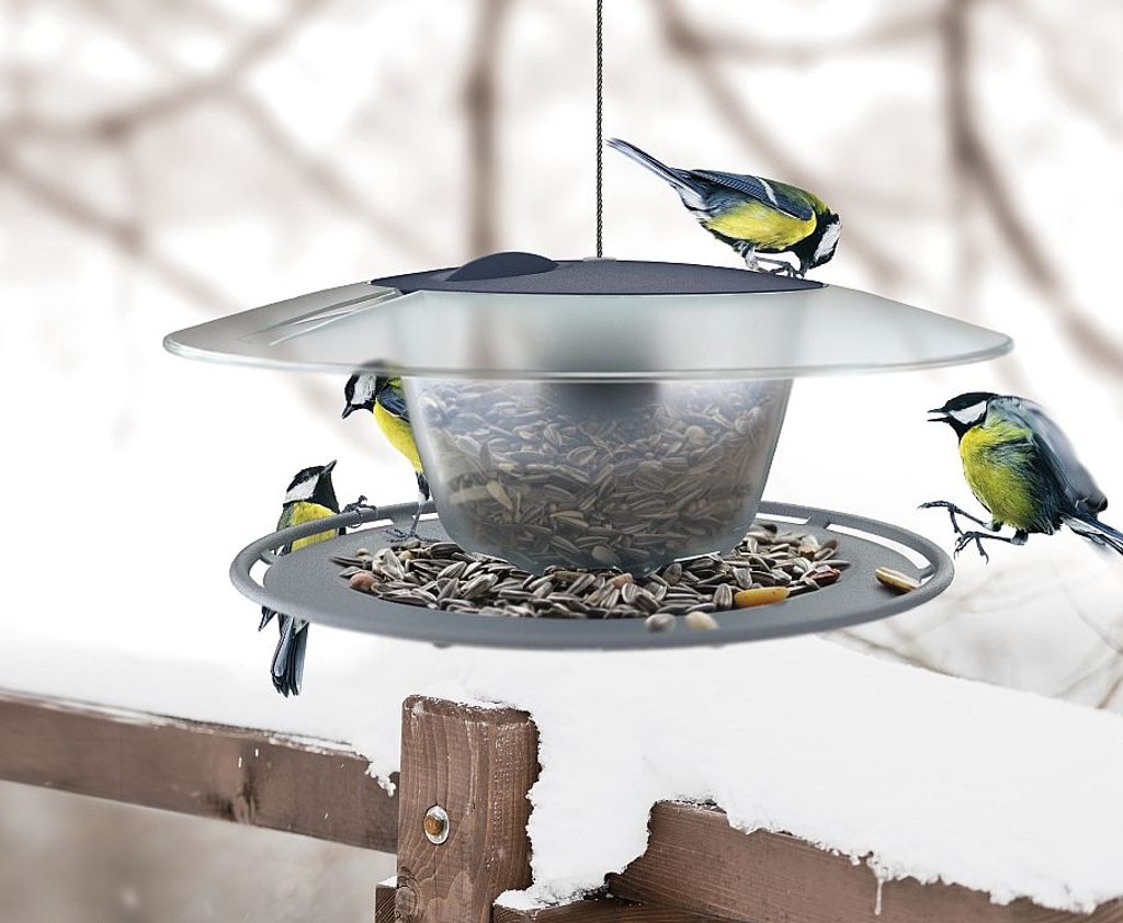 Šikmá, kulatá stříška chrání krmení před deštěm a sněhem.
