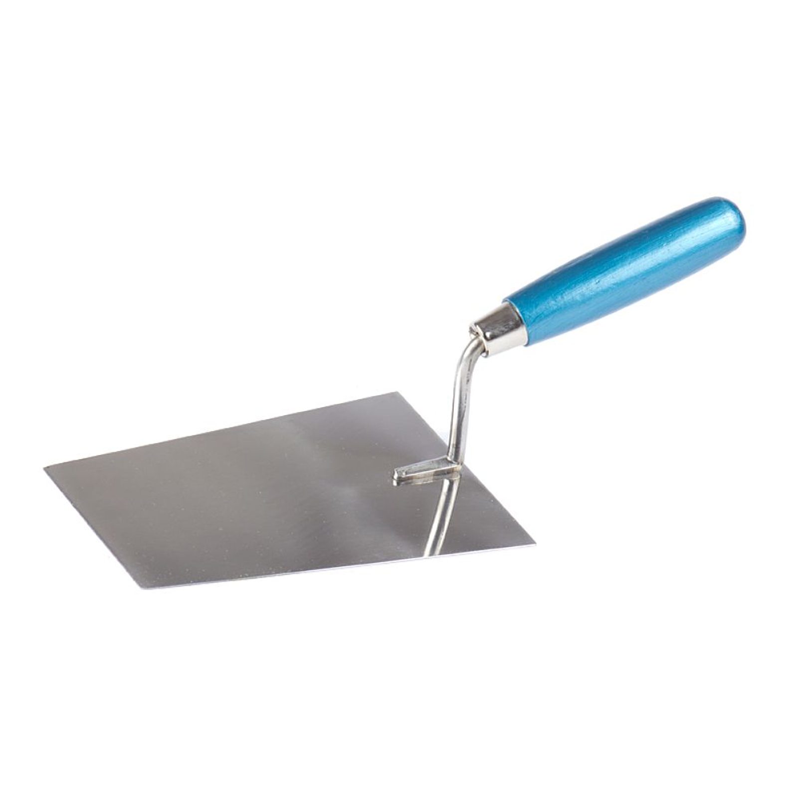 Zednická lžíce s dřevěnou lakovanou ručkou.