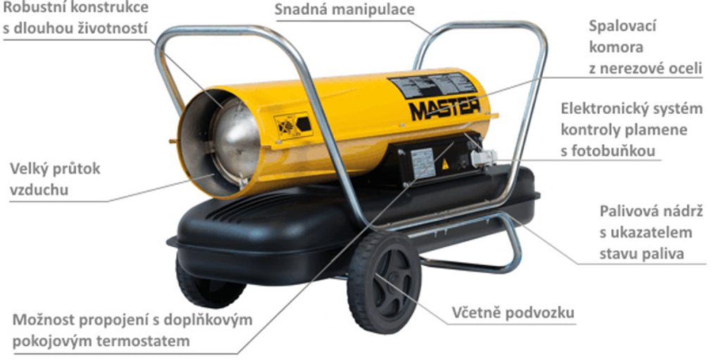 Topidlo má motor s tepelnou ochranou, robustní konstrukci se zabudovanou palivovou nádrží, spalovací komorou z nerez oceli, vnější plášť je vybaven odolným nátěrem a je stále bezpečně chladný. Topení Master B100CED je lehce přemístitelné díky své nízké hmotnosti a díky standardně dodávanému podvozku, stejně tak je lehká i jeho údržba.