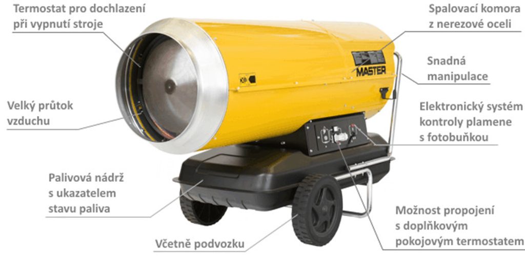 Topidlo Master B230 patří svým průtokem vzduchu 3000 m3/h k vysoce výkonným topidlům s přímým spalováním. Topení B230 disponuje termostatem zabraňující přehřátí topidla s následnou ventilací, dále má elektronickou regulaci plamene = startování.