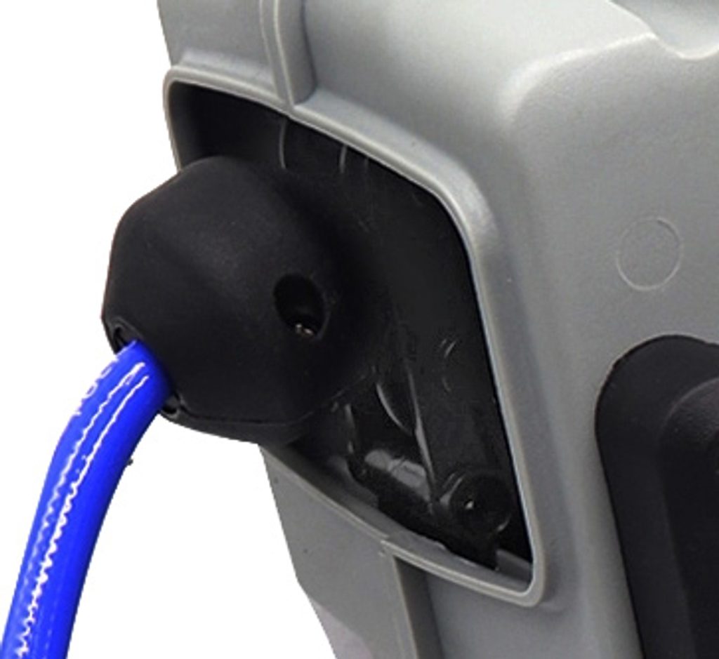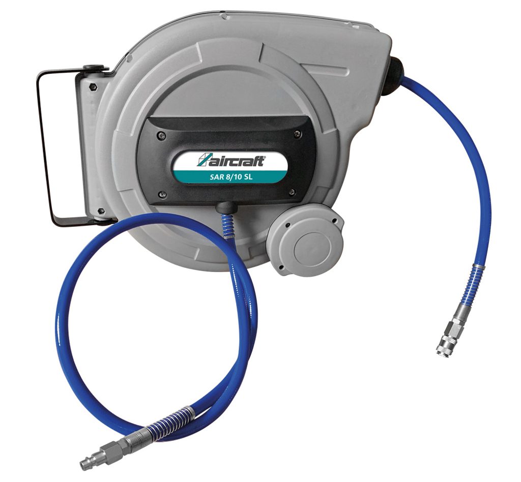 Navíjecí buben s polyuretanovou hadicí v délce 10 m s rychlospojkou a vsuvkou DN 7,4 a s integrovanou brzdou regulující rychlost navíjení hadice zpět do bubnu. Pro montáž na stěnu nebo strop.