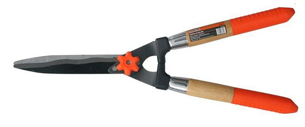 Zahradní nůžky s dřevěnými držadly jsou určeny ke stříhání živého plotu.