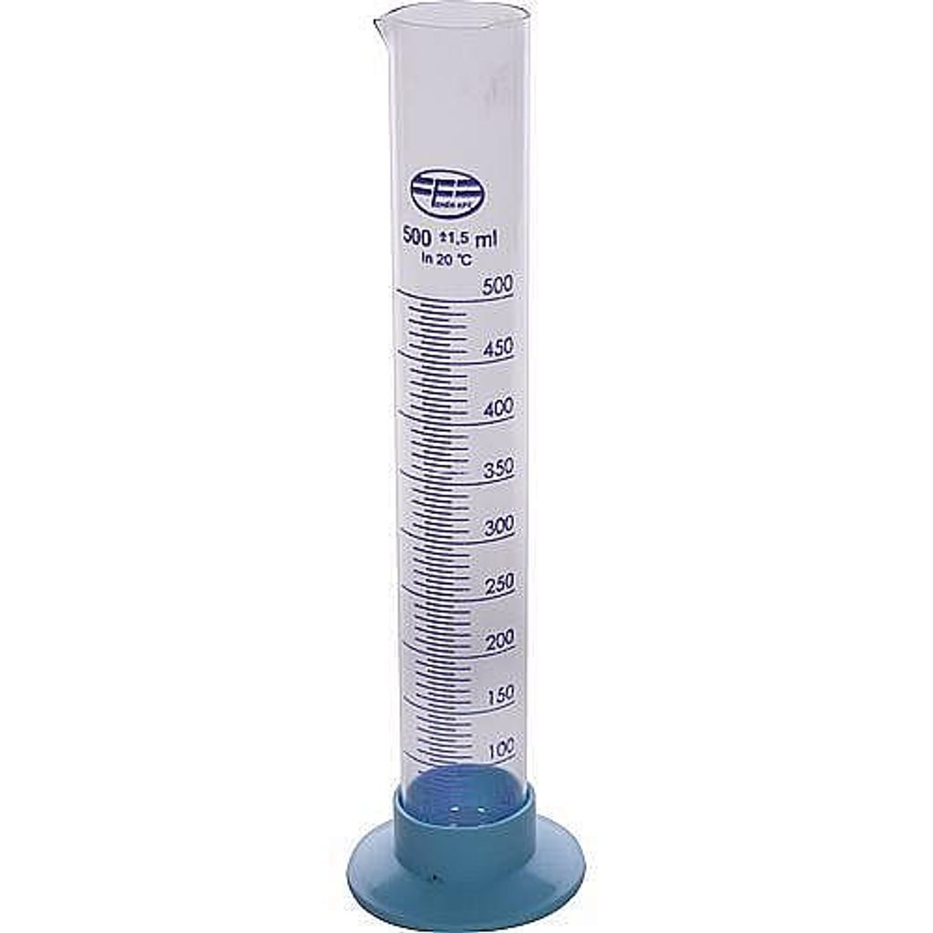 Odměrný skleněný válec slouží k měření objemu kapalin. Odměrka do 500 ml.
