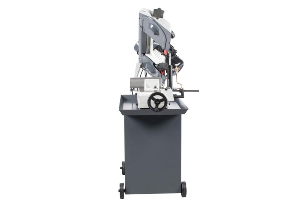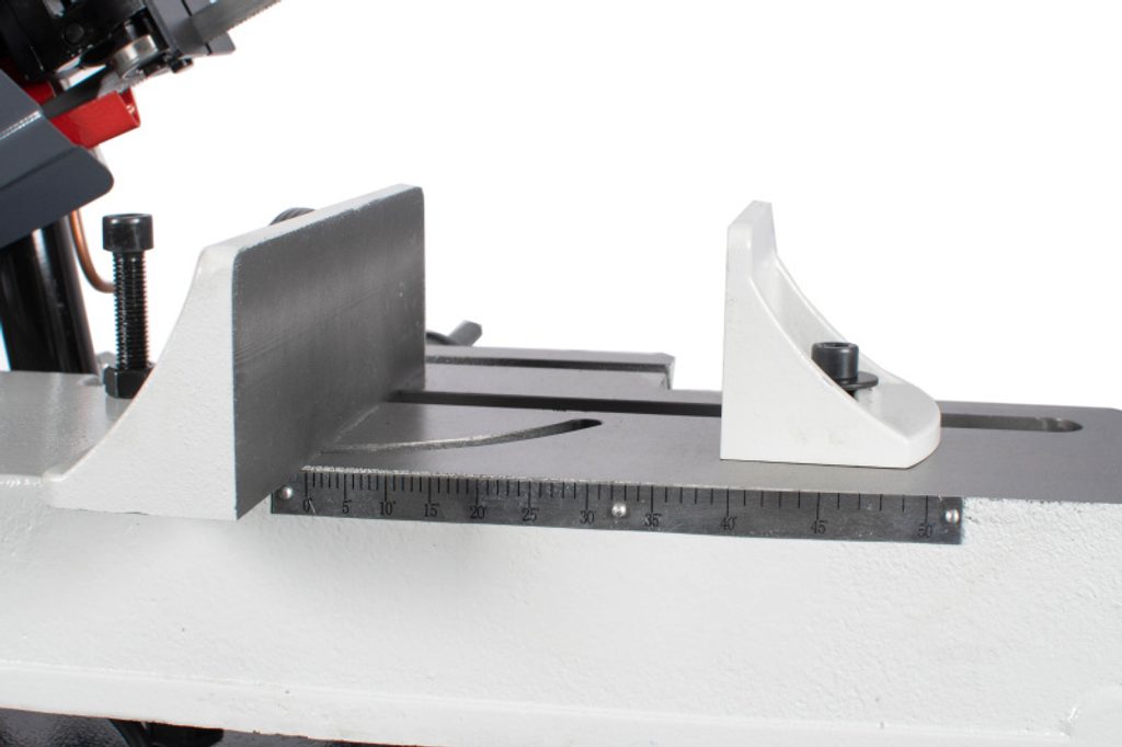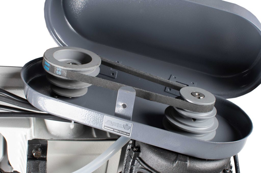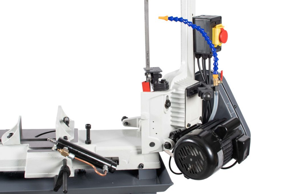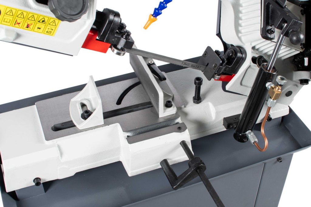 Rychlost plynulého klesání ramene pily lze korigovat za pomocí ventilu na hydraulickém válci, který lze i snadno demontovat. Řeznou rychlost pilového pásu lze manuálně nastavit na požadovanou polohu klínového řemene na řemenici, která následně přenáší pohyb přes šnekovou převodovku v olejové lázni na hnací kolo s pilovým pásem. Chladící systém je zabudovaný ve stabilním mobilním podstavci. Volba rychlosti padání ramene, k tomu optimální řezná rychlost a chlazení kapalinou v místě řezu, prodlužují životnost pilového pásu až na trojnásobek. Koncový vypínač zastavuje pilový pás po ukončení řezu u tohoto modelu automaticky. Řez pod úhlem 0-45° se provádí nastavením pevné čelisti svěráku dle stupnice umístěné na základně.