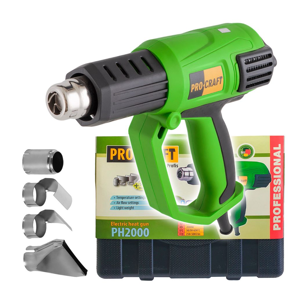 Horkovzdušná pistole Procraft PH2000 je určena k odstranění barev, laku, fólií, k sušení nových vrstev, k tvarování a ohýbání plastů. Regulace teploty v rozsahu 50-600°C a průtoku vzduchu