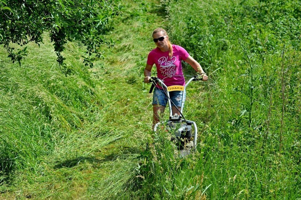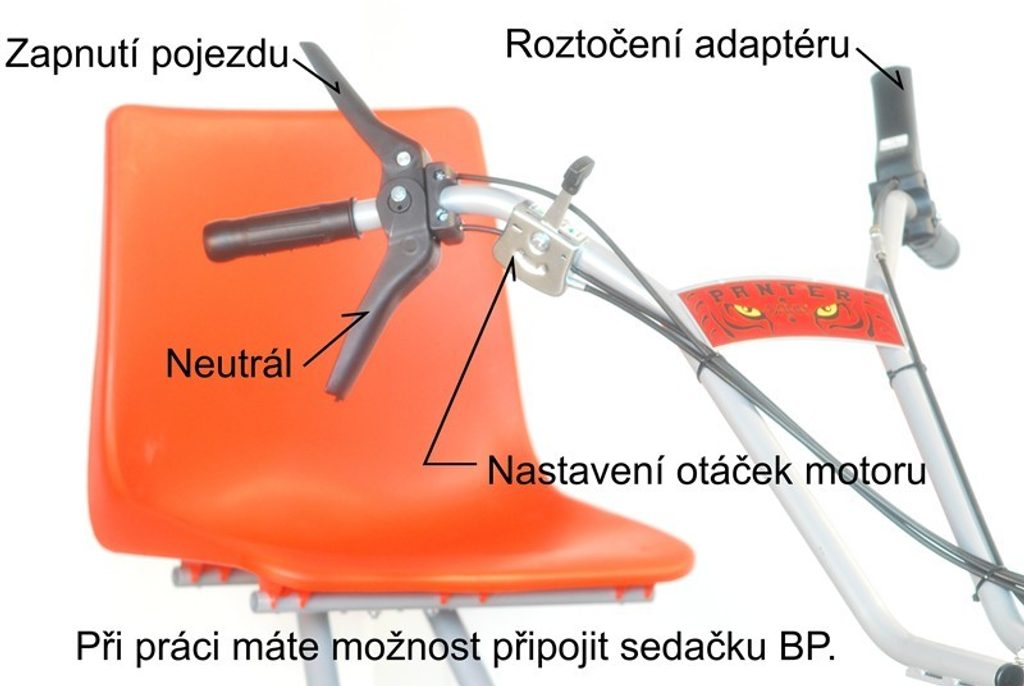 Třírychlostní stavebnicová sekačka s nastavitelnou výškou sečení a možností přestavby na 17 různých pracovních strojů. Pohon na nápravu je řešen řetězem a stroj umožňuje pohodlnou práci i vsedě díky přípojné sedačce. Jde o základní sestavu stavebnice Panter v podobě bubnové sekačky vhodné i do náročného nebo kopcovitého terénu. Stroj je vybaven motorem Kohler s objemem 224 cm³, tlakovým mazáním s filtrací oleje a litinovým válcem, což zajišťuje vysokou spolehlivost a dlouhou životnost. Na rovinách a mírných svazích má dostatečný krouticí moment (14,9 Nm) a tuhost, aby mohla obsluha při práci sedět na přídavné sedačce. V našem sortimentu najdete řadu adaptérů kompatibilních s touto pohonnou jednotkou – například mulčovač, obraceč a shrabovač sena, frézu a radlici na sníh, vozík, zametací kartáč, rotavátor, drtič větví a další. Vibrace stroje jsou minimalizovány uložením motoru na silentbloky a ergonomickým tvarováním řídítek. Parametry: Max. výkon: 3.036 m2/hod Max. šířka záběru: 69 cm Talíř: 3 nože s otočným podběhem s kuličkovým ložiskem Výška strniště: volitelná ve 3 výškách v rozmezí 2,5 - 4,5 cm Hmotnost sestavy: 79 kg Pojezd: ano, 3 rychlosti vpřed Rychlosti: 2,1 3,0 4,4 km/hod Náprava: pevná Převodovka: šneková české výroby, s kaleným a broušeným šnekem a bronzovým šnekovým kolem Útlum vibrací motoru: 4 silentbloky Řidítka: nastavitelná výškově i do stran Pneumatiky: velká foukaná kola 420 mm s šípovým vzorem Vnější obrys kol: volitelný, 65 a 68 cm Motor: 4-takt Kohler Command PRO CV224 Palivo: benzin Natural 95 Obsah motoru: 224 cm3 Válec: litinová vložka Pracovní otáčky motoru: 3.060 ot/min Výkon motoru při 3.060 ot/min: HP/ kW Kroutící moment při 3.060 ot/min: 14,9 Nm Mazání motoru: tlakové Startování: ruční s mechanickým sytičem