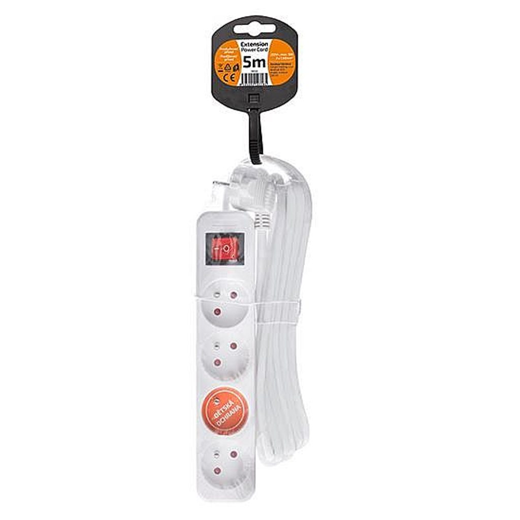Prodlužovací kabel o délce 5 metru se 4 zásuvkami a vypínačem vhodný pro vnitřní prostory.