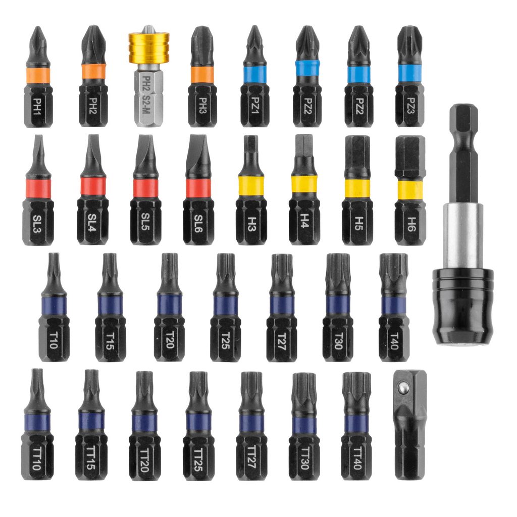 30 ks 25mm bitů: Phillips: PH1, PH2, PH3, Pozi: PZ1, 2xPX2, PZ3 Ploche: SL3, SL4, SL5, SL6 Torx: T10, T15, T20, T25, T27, T30, T40