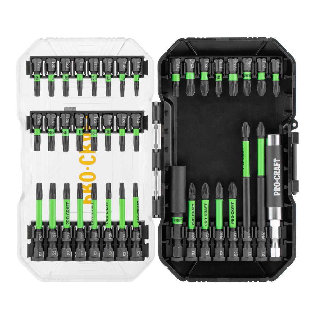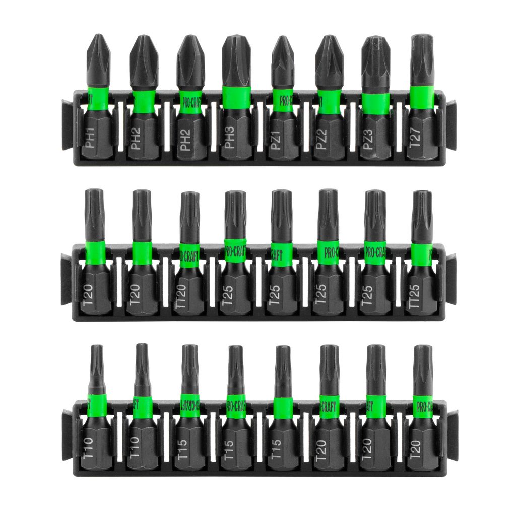 25 ks 25mm bitů: Phillips: PH1x1, PH2x2, PH3x1, Pozi: PZ1x1, PZ2x1, PZ3x1, Torx: T10x2, T15x3, T20x5, T25x4, T27x1, T30x1, T20 Security, T25 Security