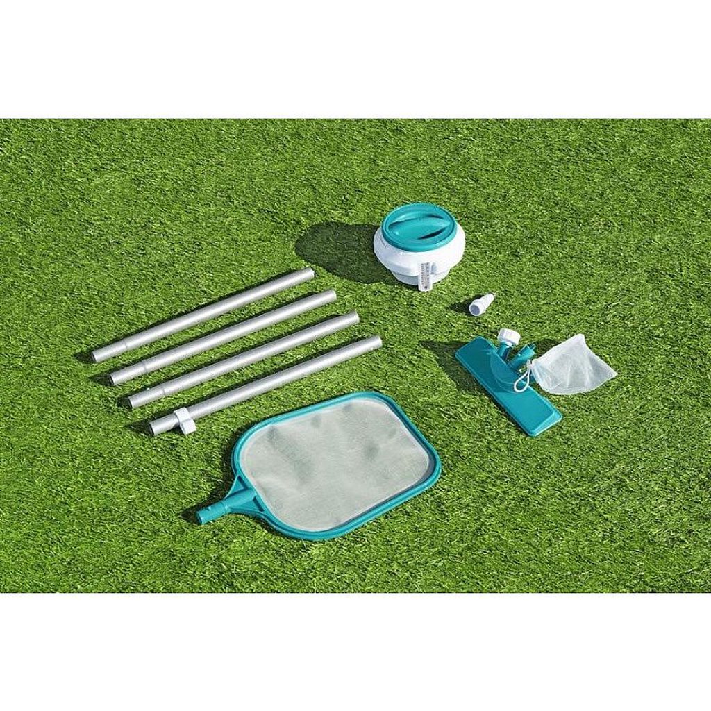 Souprava pro údržbu bazénu Bestway FlowClear 58794 zahrnuje lehkou tyč s vyměnitelnými vysávacími a skimmerovými hlavami.