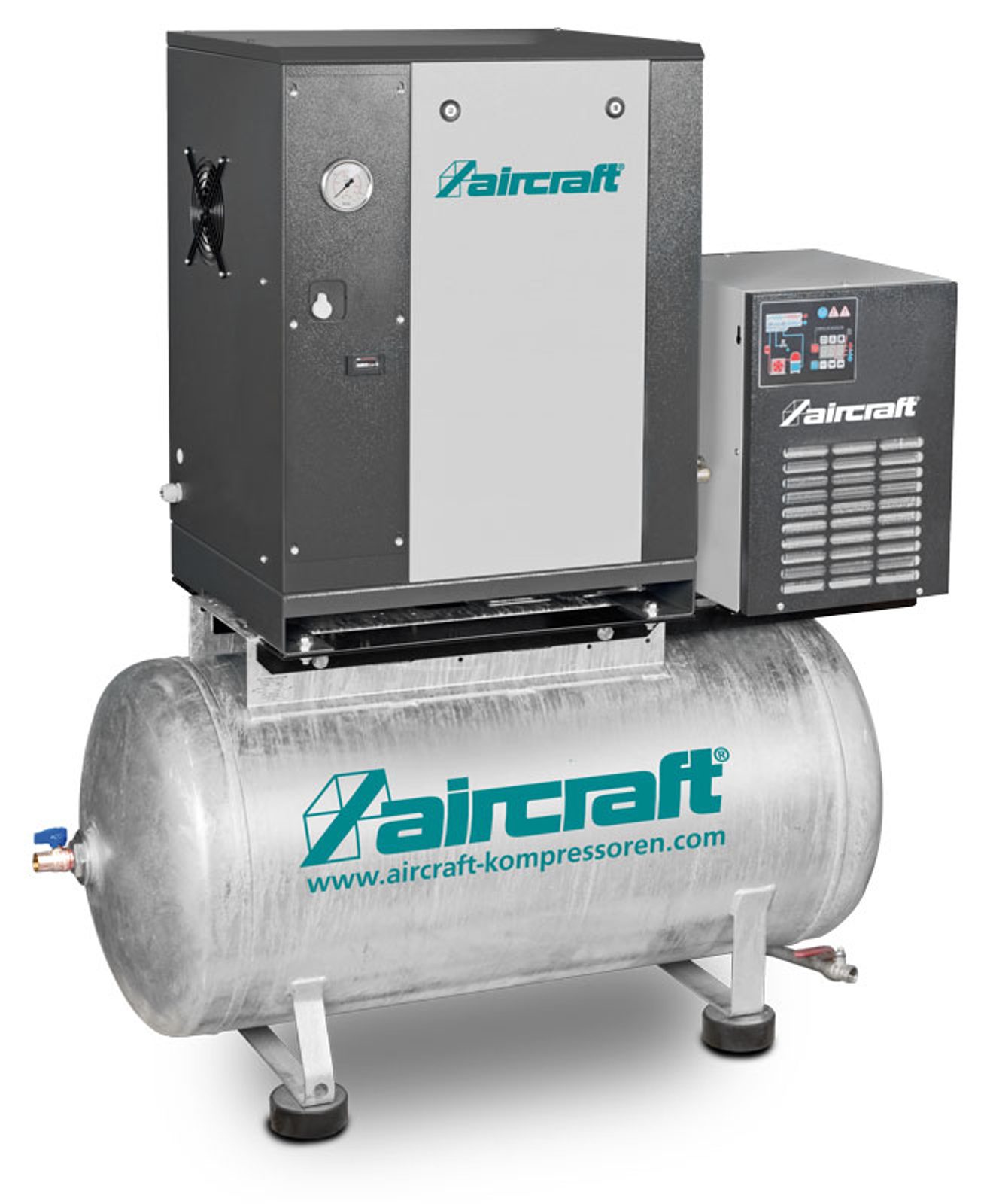 Šroubový kompresor o výkonu 4 kW s řemenovým pohonem, odhlučněnou skříní, tlakovou nádoboua a kondenzační sušičkou, určený pro trvalý provoz i při nižší spotřebě vzduchu.