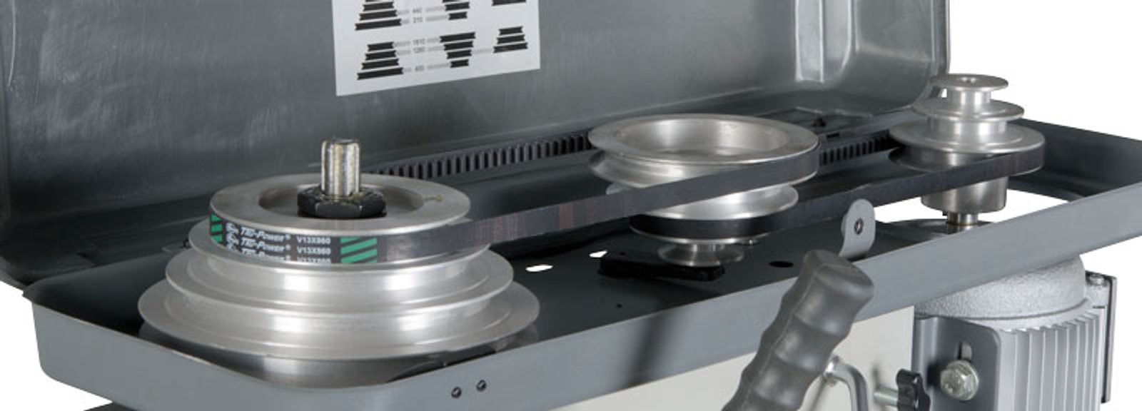 Stolní vrtačka s řemenovým pohonem a digitálním ukazatelem otáček a vrtací hloubky na vrtací hlavě.