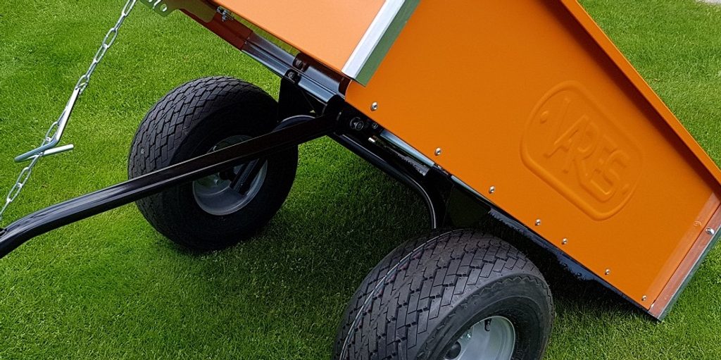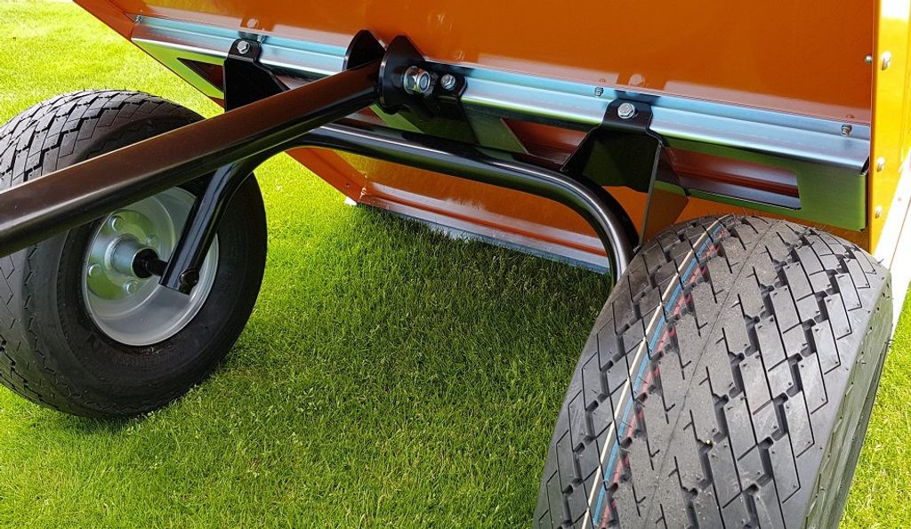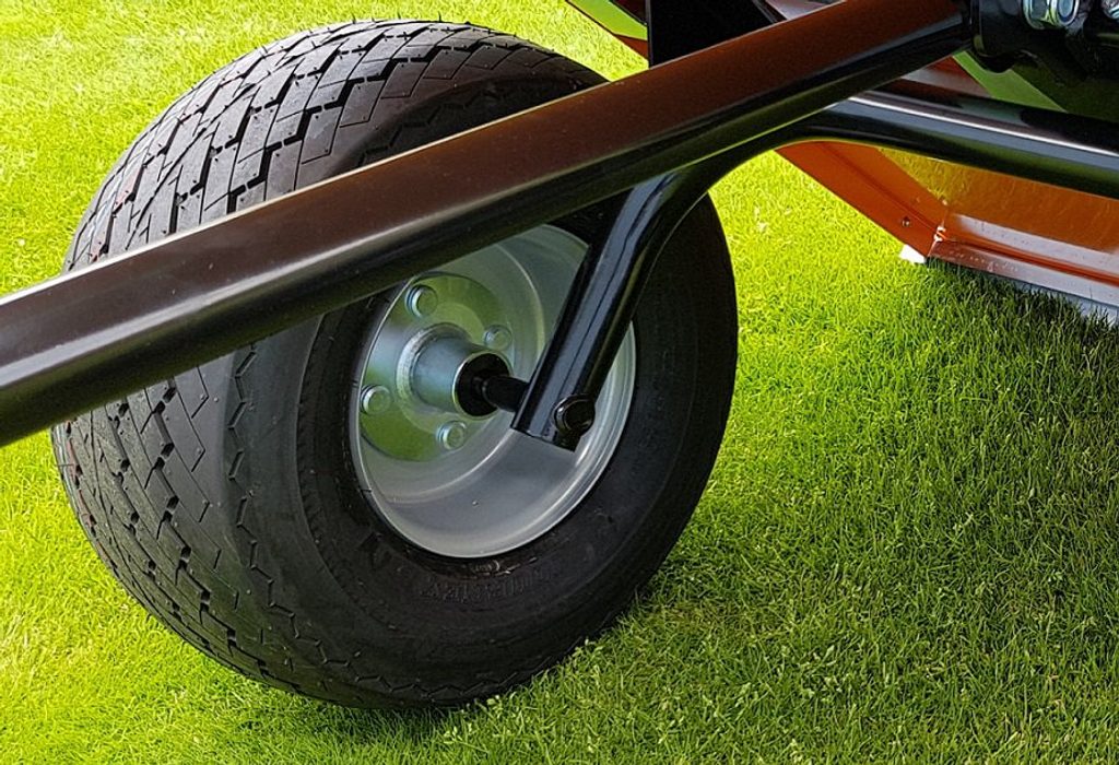 Vozík je dodáván se sestavenou nápravou, jednoduchá a rychlá montáž kol na 4 šrouby. Dezén pneumatik je velmi šetrný k trávníku.