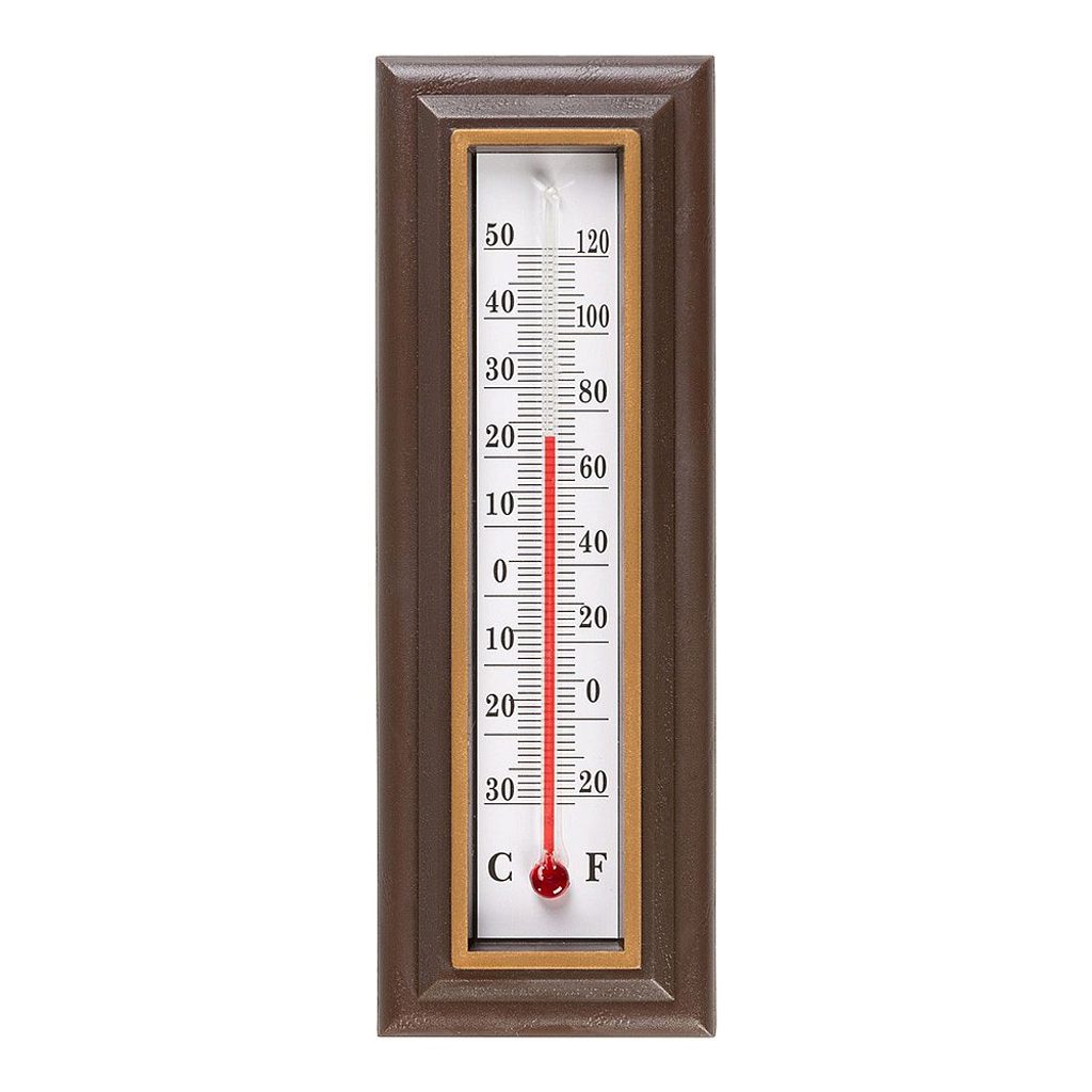 Venkovní teploměr s plastovým podkladem v retro stylu, měří teplotu v rozsahu od -30 až +50 °C.
