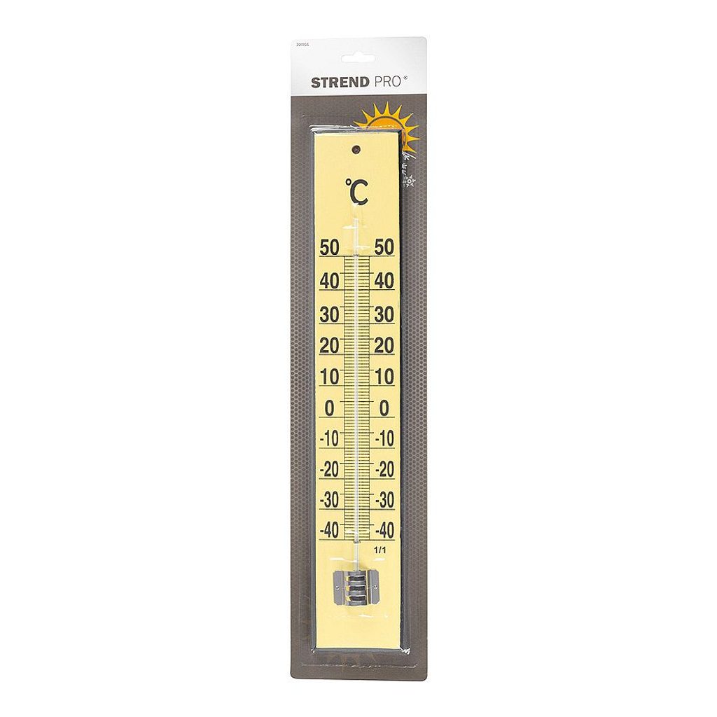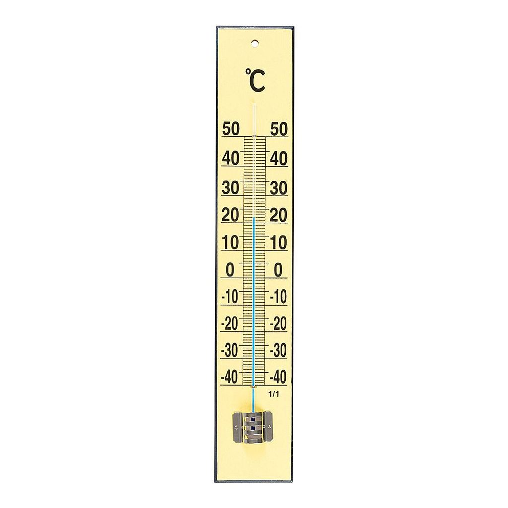Vnitřní a vnější teploměr s dřevěným podkladem, měří teplotu v rozsahu od 50°C do -40°C.