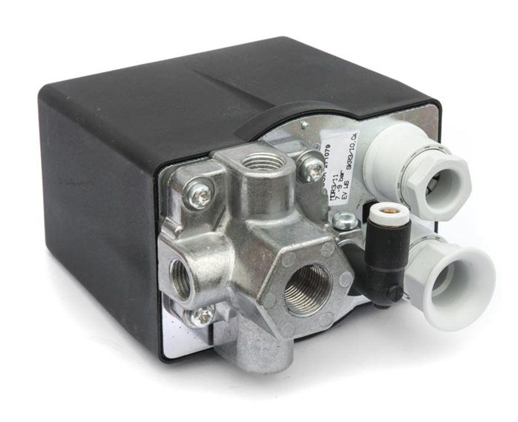 Tlakový spínač s nastavitelným vypínacím tlakem 4 – 11 bar. Třípólový vypínač a odvzdušňovací ventil. Pro kompresory s elektromotory 2,2 - 4 kW.