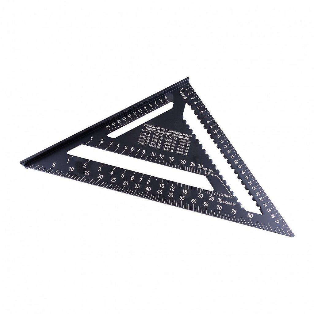 Přepona má stupnici od 0° do 90° a stupnici pro tvorbu běžných krokví, nárožních a úžlabních trámů.