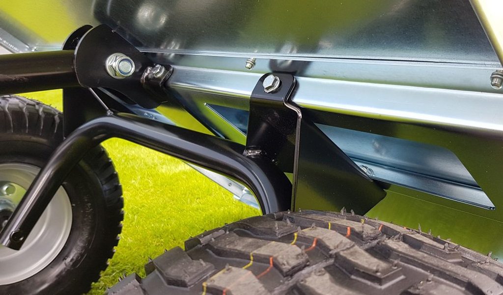 Vozík je dodáván se sestavenou nápravou, jednoduchá a rychlá montáž kol na 4 šrouby. Dezén pneumatik je velmi šetrný k trávníku.